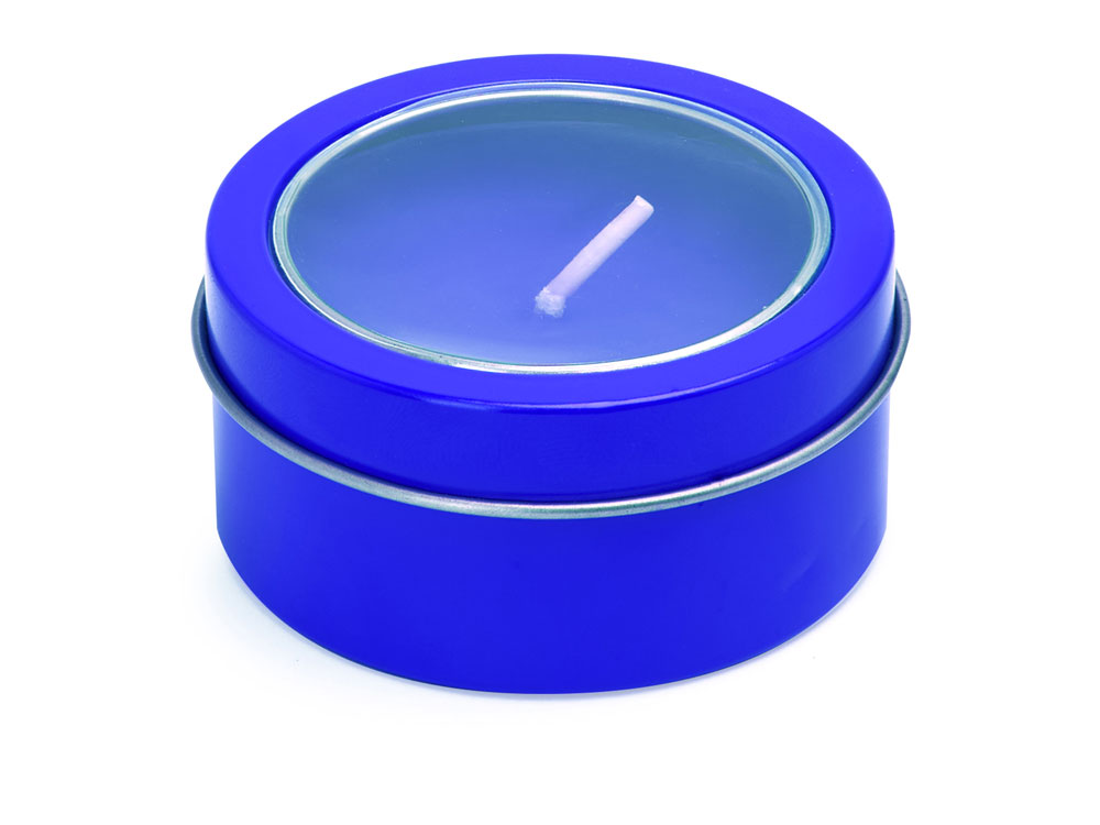 Ароматическая свеча с запахом ванили в металлическом круглом подсвечнике с крышкой с прозрачным окошком. Цвет свечи в тон подсвечника. белый фитиль