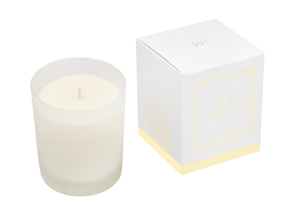Коллекция аромасвечей Exclusive является уникальной не только из-за ароматов коллекции, но и благодаря тщательно разработанному дизайну упаковки, которая является напоминанием о том, что бренд Lights of Moscow - это ручное российское производство в самом центре Москвы. Белая коробка оформлена ярким золотым фольгированием, на левой стороне которой изображен Храм Василия Блаженного - одна из главных достопримечательностей на Красной площади в Москве. Пудровый, цветочный аромат во главе с болгарской розой, фиалкой и жасмином дарят нежное, тонкое, но одновременно роскошное сочетание. Элегантный дуэт дополняют ноты боярышника, ванили и белого мускуса. Ноты: болгарская роза, боярышник, фиалка, жасмин, ваниль и белый мускус Комплектность: - Свеча в окрашенном стакане - 1 шт. - Подарочная эксклюзивная коробка с ложементом и репсовой лентой - 1 шт. - Пыльник - 1 шт. Условия хранения: — Свечи, аромасаше, аромадиффузоры, SPA-наборы следует хранить при температуре +18…+24 °C, вдали от источников тепла, сквозняков и прямых солнечных лучей. — Рекомендуемая влажность — не более 50%. — Избегайте длительного воздействия яркого света.