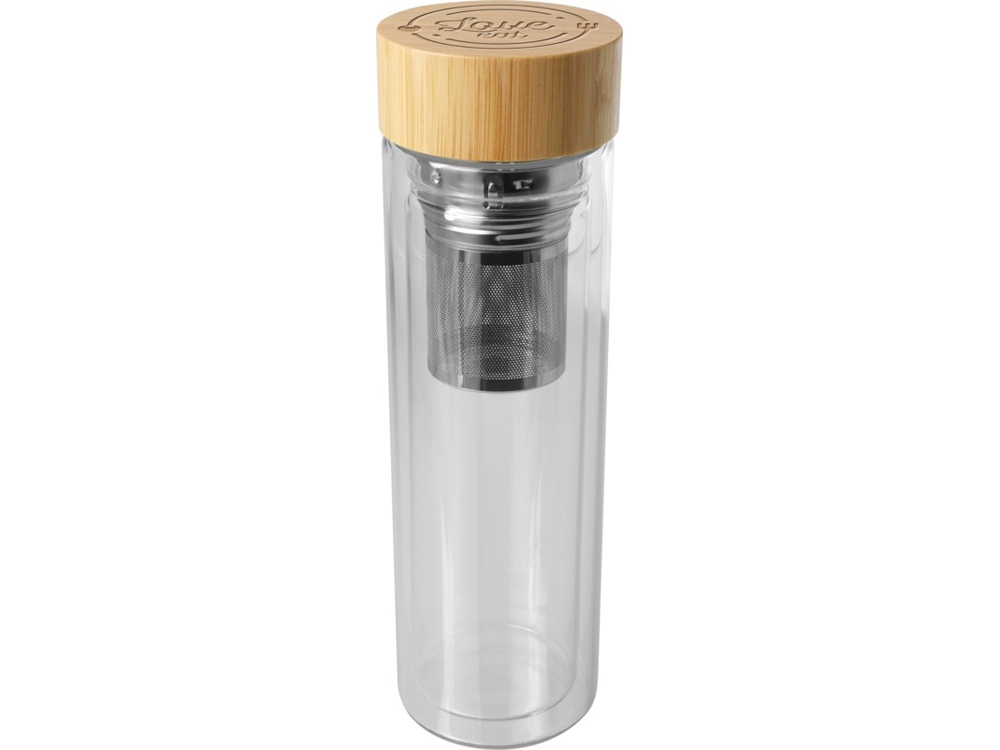 Бутылка для воды из боросиликатного стекла с двойными стенками, заварником для чая и бамбуковой крышкой. Используемый бамбук поступает из устойчивых, экологически чистых и социально ответственных источников. Объем: 400 мл. Поставляется в коробке из переработанного картона. Borosilicate glass.