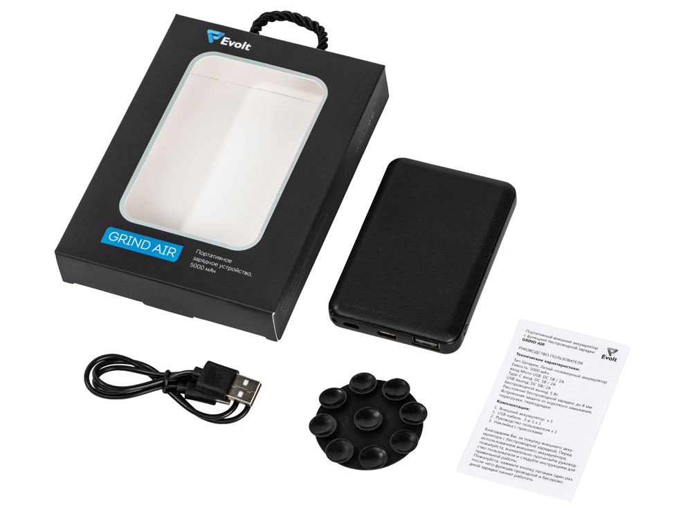 Суперкомпактный и легкий внешний аккумулятор с функцией беспроводной зарядки 5 Вт. Корпус из прочного ABS-пластика имеет специальную тактильную поверхность для защиты от царапин и случайного выскальзывания из рук. Надежная литий-полимерная батарея А-класса емкостью 5000 мАч. В комплекте кабель USB – Micro-USB и отдельная секция с присосками. Стикер с присосками можно при желании наклеить на повербанк, чтобы его можно было крепить к задней стенке Вашего смартфона. Таким образом смартфоном можно продолжать пользоваться и звонить без всяких неудобств даже во время зарядки. - Функция беспроводной зарядки. - Суперкомпактный и легкий. - Батарея класса А емкостью 5000 мАч. - Тактильное защитное покрытие корпуса. - Отдельная секция с присосками для максимального удобства пользования.