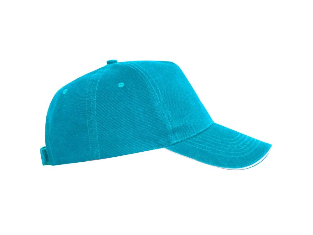 Бейсболка из 5 панелей с контрастным сэндвичем. Четыре вышитых вентиляционных люверса. Застежка на липучку.