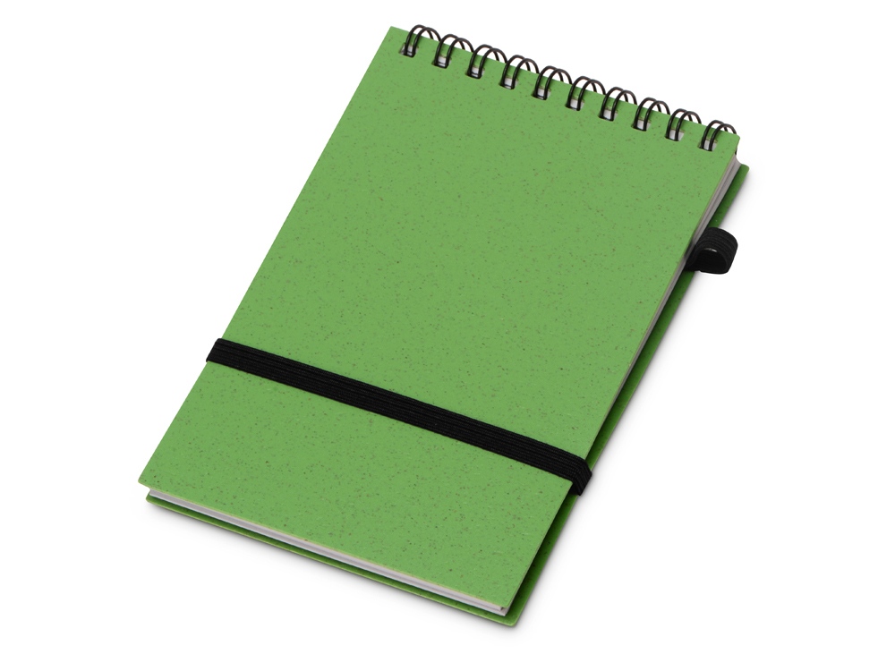 Блокнот с обложкой из переработанной пшеницы и пластика. Блок состоит из 60 листов переработанной бумаги белого цвета. Крепление - пружина. В комплекте шариковая ручка из пшеничной соломы.
