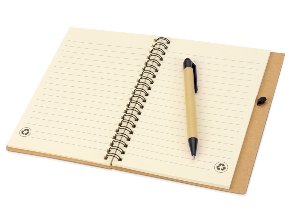 Блокнот с 60 листами переработанной бумаги 70 г/м2 и картонной ручкой в цвет блокнота.