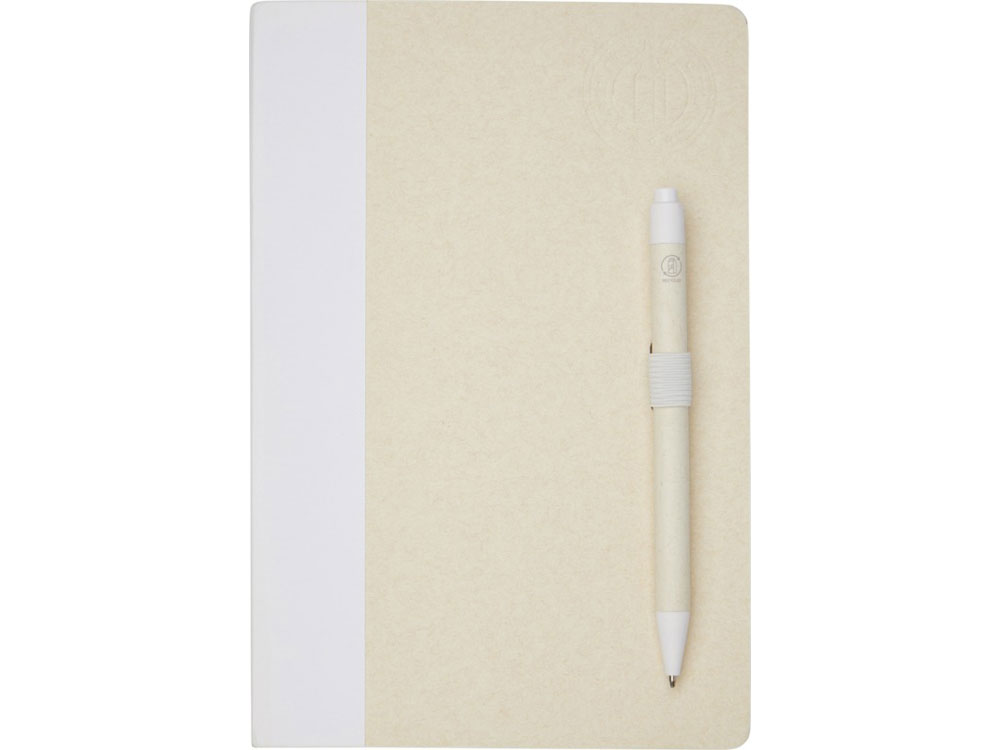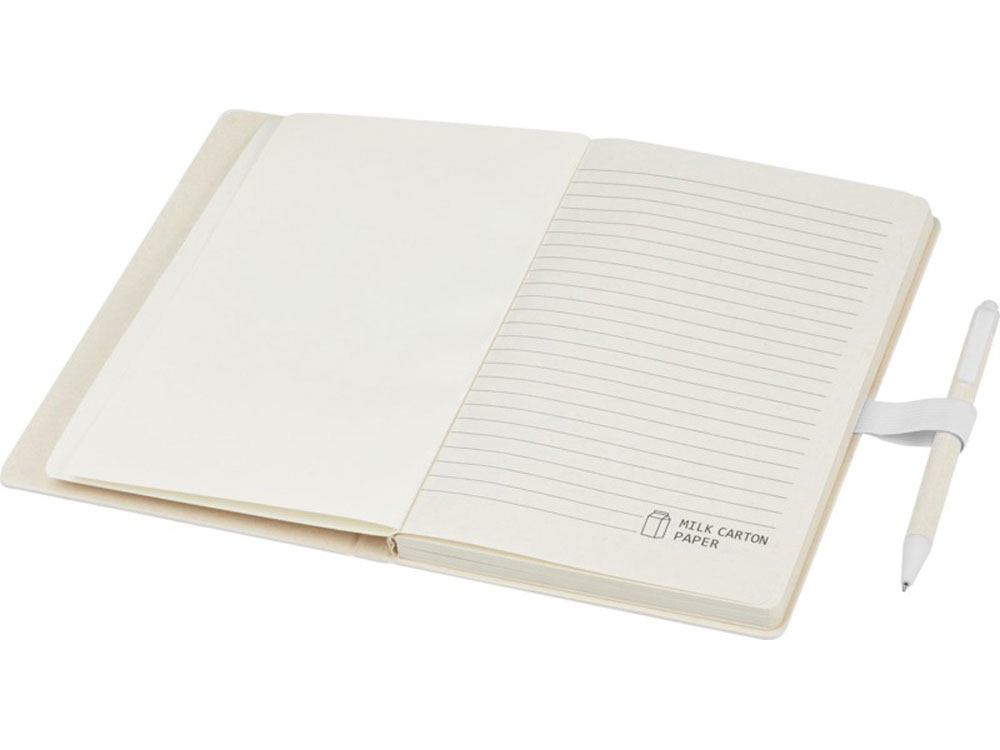 Блокнот A5 Dairy Dream с шариковой ручкой. Блокнот имеет 80 линованных листов (80 г/м²) из переработанных коробок из-под молока (до 70%), цветную спираль для бумаги и петлю для ручки. В петле находится шариковая ручка с кнопочным механизмом, цвет которой соответствует цвету блокнота. Корпус ручки также изготовлен из переработанных коробок из-под молока, а кнопка, зажим и наконечник изготовлены из цветного PLA-пластика. Внутри ручки имеется черный стержень. Картонные коробки из-под молока собираются, сортируются, перерабатываются и превращаются в бумагу, таким образом действительно превращая мусор во что-то полезное.