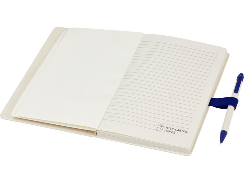 Блокнот A5 Dairy Dream с шариковой ручкой. Блокнот имеет 80 линованных листов (80 г/м²) из переработанных коробок из-под молока (до 70%), цветную спираль для бумаги и петлю для ручки. В петле находится шариковая ручка с кнопочным механизмом, цвет которой соответствует цвету блокнота. Корпус ручки также изготовлен из переработанных коробок из-под молока, а кнопка, зажим и наконечник изготовлены из цветного PLA-пластика. Внутри ручки имеется черный стержень. Картонные коробки из-под молока собираются, сортируются, перерабатываются и превращаются в бумагу, таким образом действительно превращая мусор во что-то полезное.