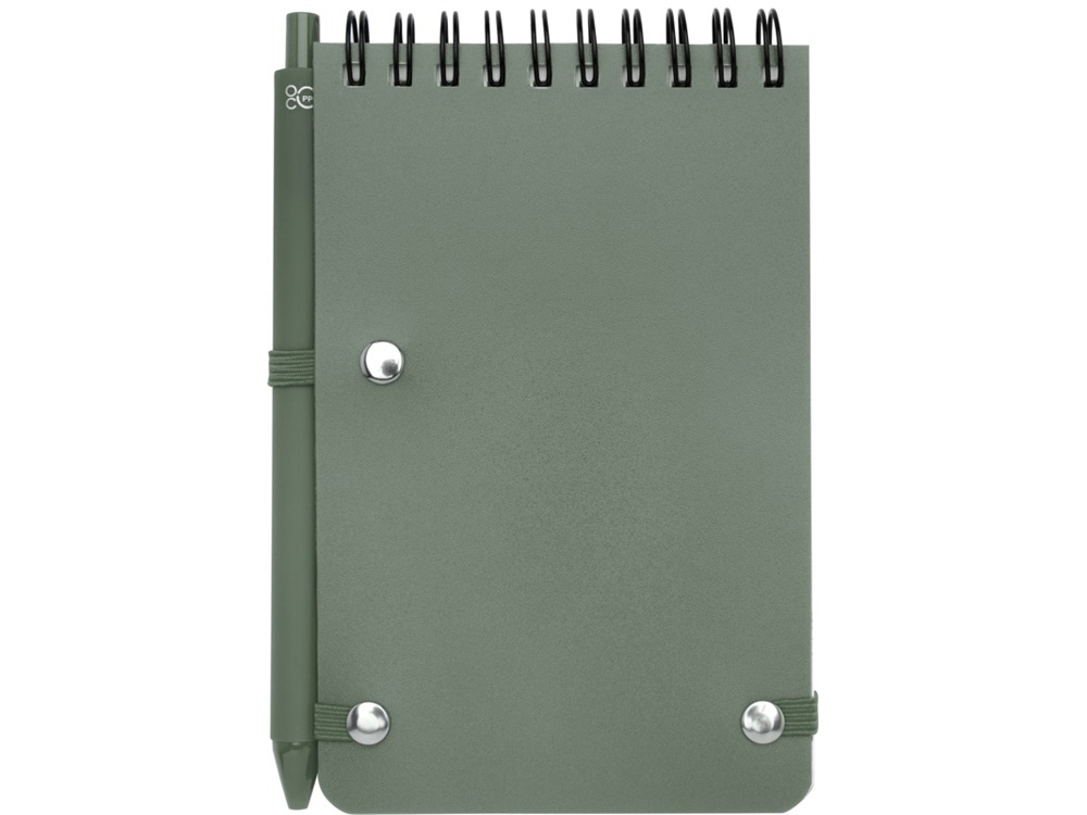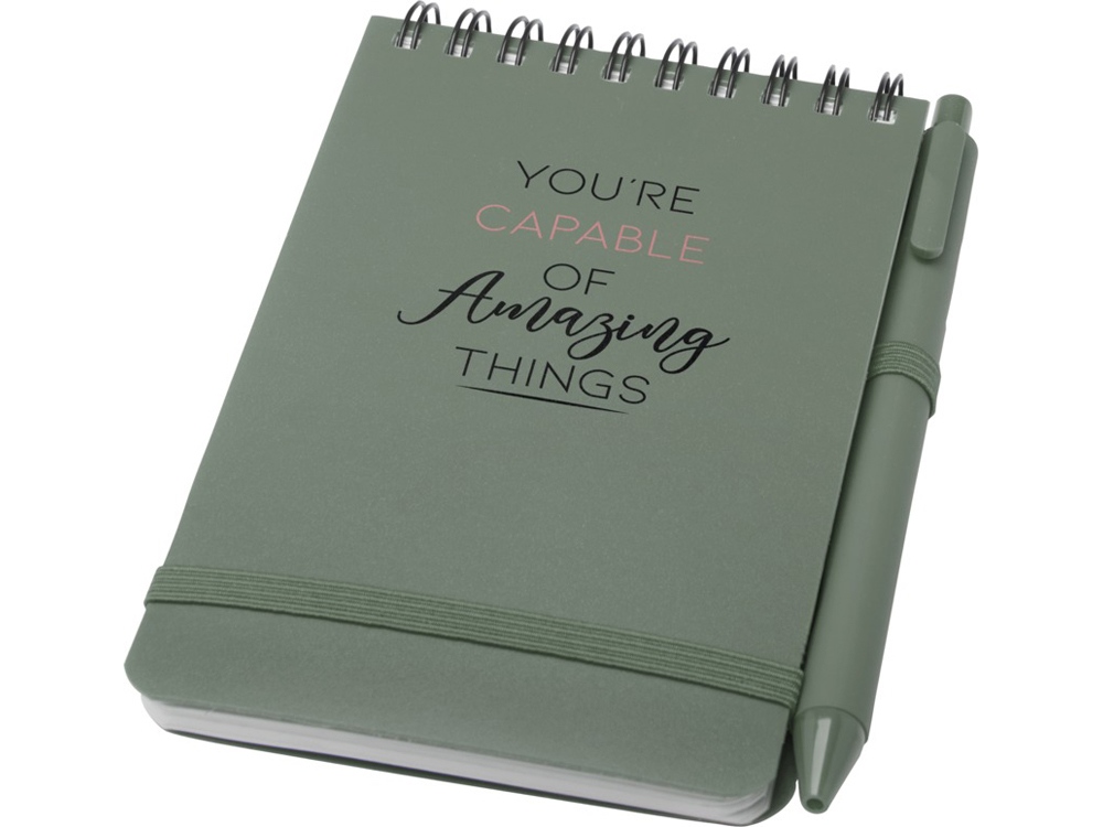 Блокнот Thalaasa формата А6 в твердой обложке изготовлен из переработанного океанического пластика и содержит 80 линованных листов кремовой бумаги плотностью 70 г/м². Блокнот имеет закругленные углы, эластичную застежку и петлю для ручки. Шариковая ручка с черными чернилами также изготовлена из переработанного океанического пластика. Длина непрерывной линии: 1000 метров. Размер пера: 1,0 мм.
