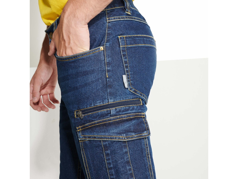 Джинсы с несколькими карманами. · Застежка на металлическую молнию и пуговицу. · Пояс со шлевками. · Один карман карго с левой стороны, с клапаном на липучке. · Один карман на молнии с левой стороны. · Двойной узкий карман с правой стороны. · Контрастные отстрочки.
