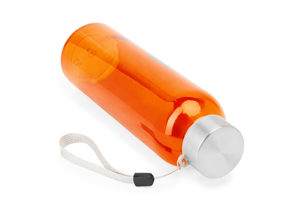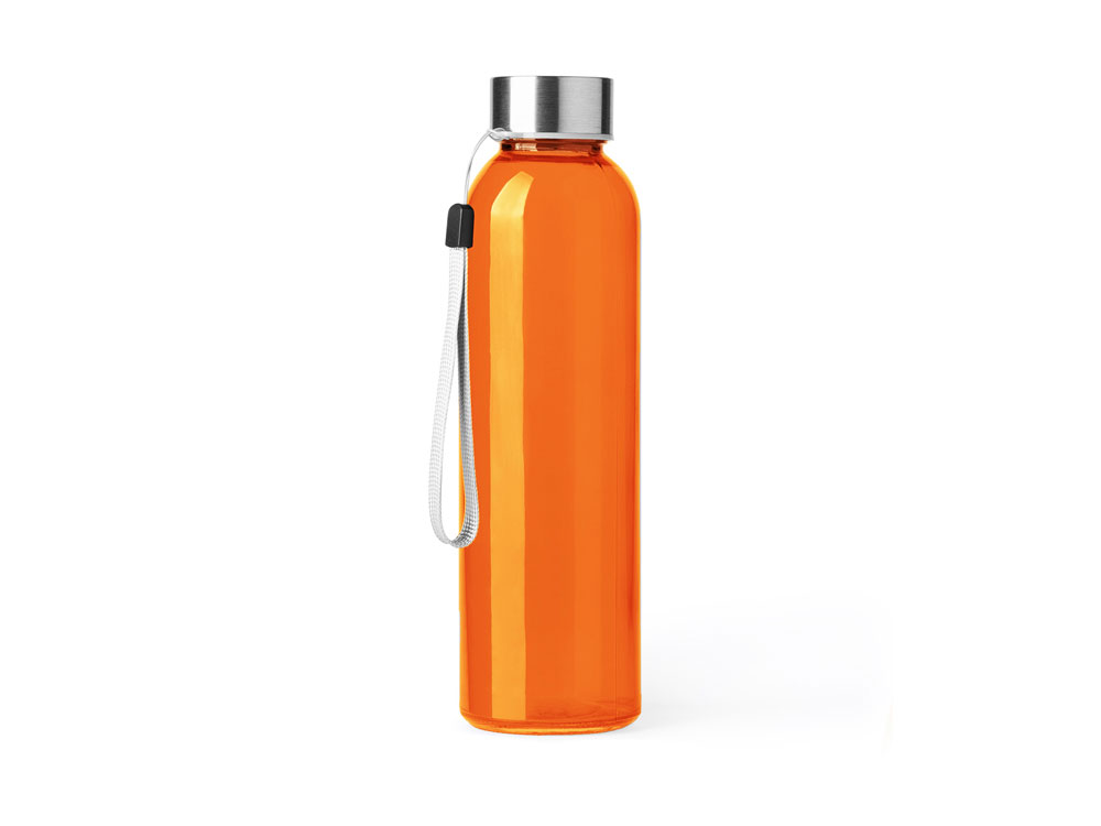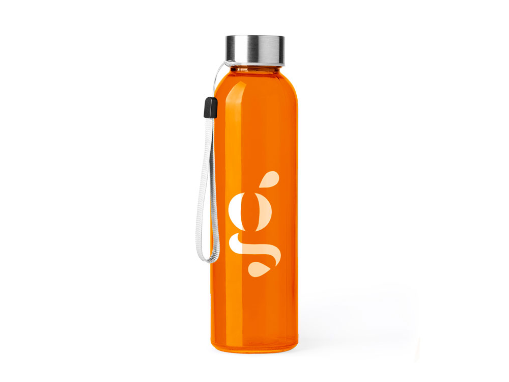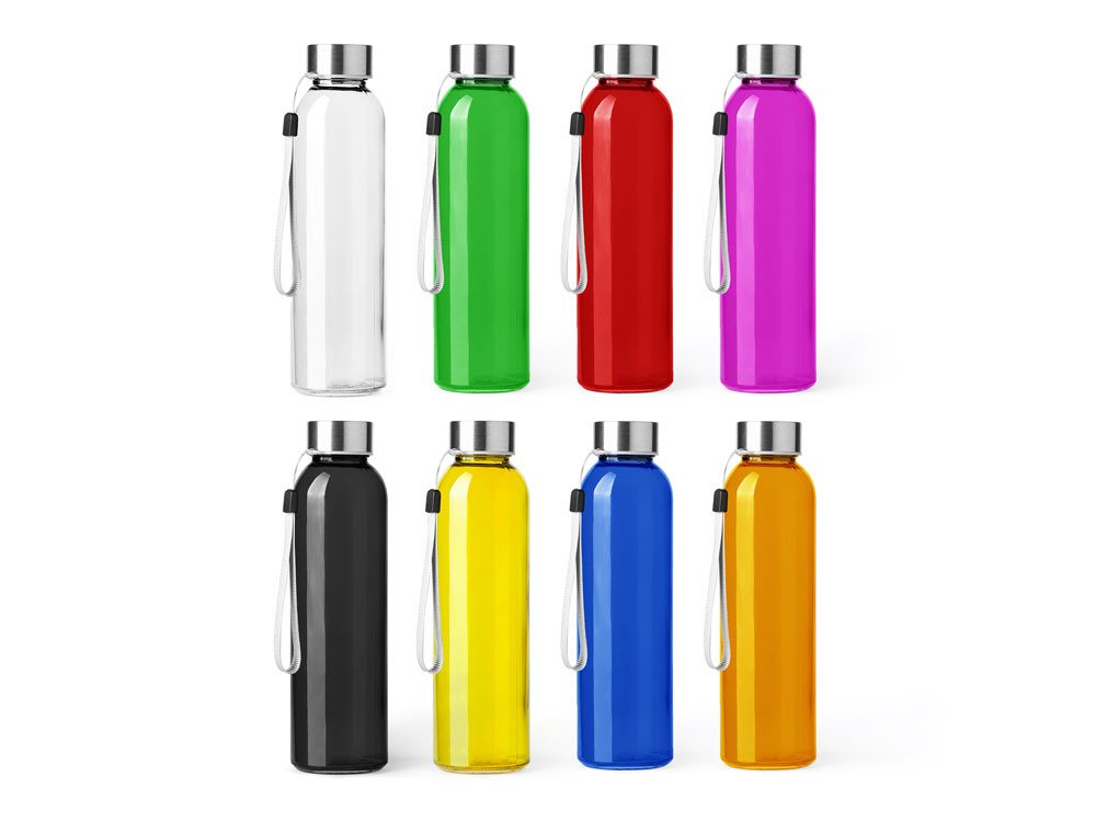 Стеклянная бутылка емкостью 500 мл. Большое разнообразие цветов, с завинчивающейся крышкой из нержавеющей стали и удобной для транспортировки благодаря ремешку серого цвета.