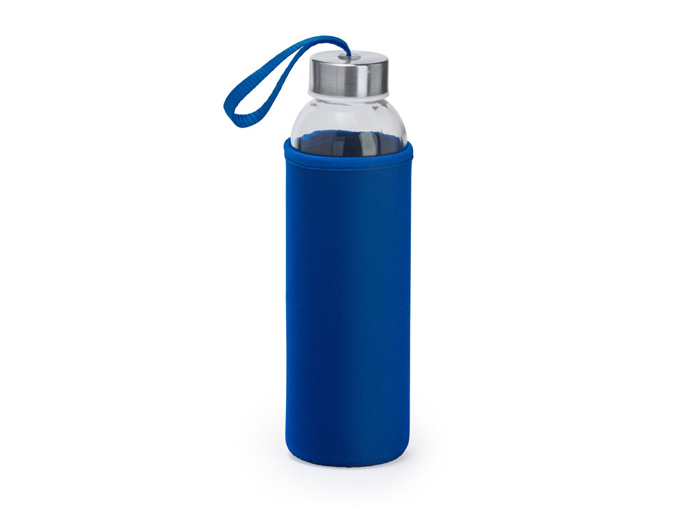 Бутылка стеклянная CAMU в чехле из неопрена, 500 мл, прозрачный/королевский синий купить оптом и в розницу с нанесением логотипа в Нижнем Новгороде