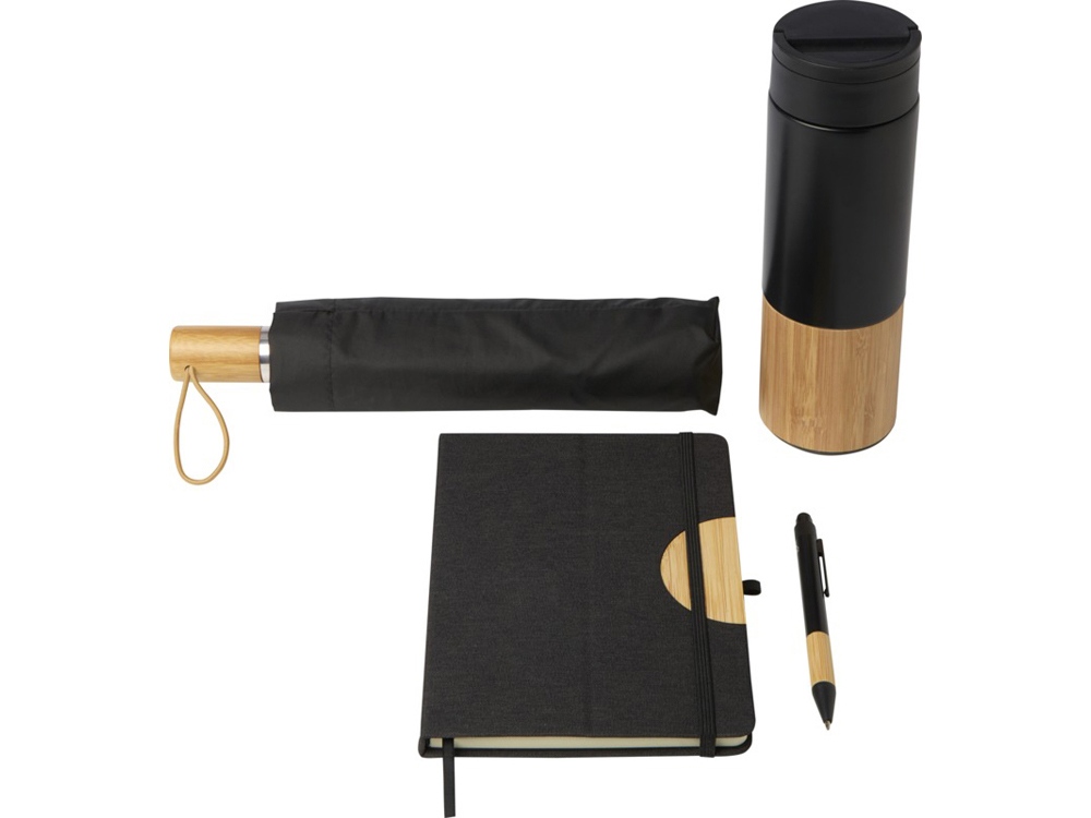 Подарочный набор Carmen включает блокнот формата А5 в твердой обложке, шариковую ручку, бутылку с водой и зонтик. Блокнот имеет черную эластичную застежку и ленточную закладку, а также 80 разлинованных листов бумаги плотностью 80 г/м² кремового цвета. Чехол для ноутбука вместе с бамбуковым полукругом выполняет функцию подставки для телефона. Шариковая ручка изготовлена из переработанного алюминия, сертифицированного RCS, с черным напылением и бамбуковой рукояткой. Чернила для ручки: черный. Длина непрерывной линии: 1000 метров. Бутылка для воды объемом 450 мл изготовлена из нержавеющей стали и украшена бамбуковым аксессуаром на дне. Только ручная мойка. Размер бутылки: 6,6 х 22,2 см. Зонт диаметром 21 дюйм имеет черный купол из эпонжа, черный металлический стержень, черные спицы из стекловолокна и бамбуковую ручку. Размер зонта: 28,3 x 5,5 см. Размер подарочной коробки: 36 x 30 x 8 см. . FSC certified paper, Recycled PET Polyester, Recycled Aluminium. #?0:>2:0: FSC Mix Credit P5.1 CU-COC-877277. FSC Mix Credit P7.1 CU-COC-877277.