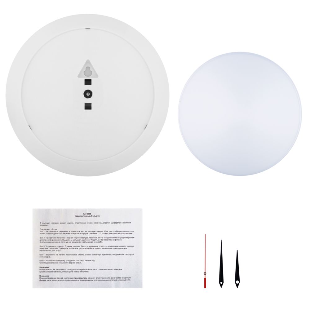 Часы поставляются в разобранном виде: корпус, крышка, стрелки, механизм и индивидуальная упаковка — коробка. Часовая и минутная стрелки — черного цвета, секундная — красного цвета.