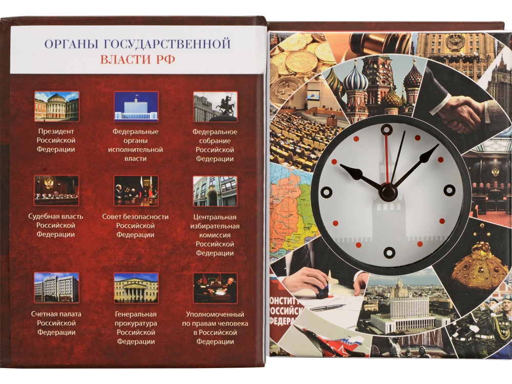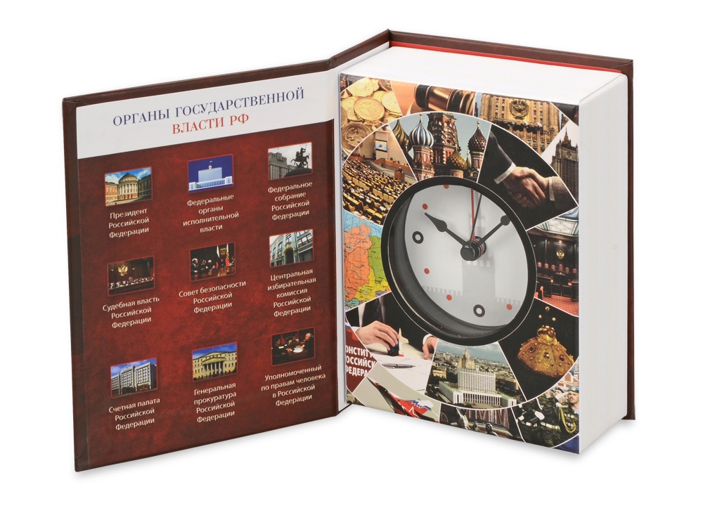 Часы в виде книги Государственное устройство Российской Федерации подойдут самым серьезным офисам: как в сфере бизнеса, так и для чиновников. Это оригинальный подарок и стильный аксессуар.