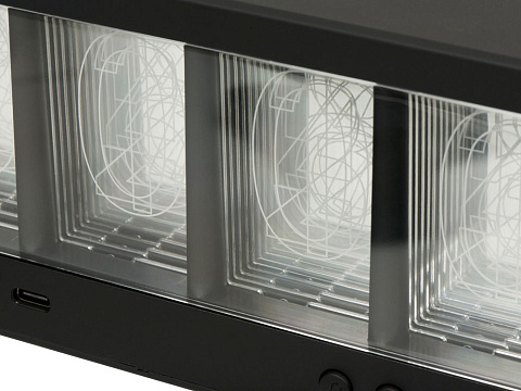 Часы с необычным дизайном и светодиодной подсветкой цифр. Cyber впишется в любой интерьер благодаря большому количеству цветов подсветки и минималистичному дизайну. Корпус имеет софт-тач покрытие. 3 режима работы: • постоянная подсветка (7 цветов на выбор); • RGB-режим, горят все цифры (с поочерёдной сменой цветов); • RGB-режим, разные цвета на каждой половине дисплея (с поочерёдной сменой цветов). Также можно регулировать степень яркости подсветки, которая имеет 3 уровня интенсивности. Посередине корпуса расположена беспроводная зарядка для смартфонов мощностью 10 Вт, а также два дополнительных зарядных разъёма USB-A и USB-C. Кабель с поддержкой быстрой зарядки в комплекте. - светодиодная подсветка цифр; - 3 режима свечения с регулировкой яркости; - 7 цветов и 2 RGB-режима; - беспроводная зарядка, 10 Вт; - 2 зарядных разъёма USB-A и USB-C; - кабель быстрой зарядки в комплекте.