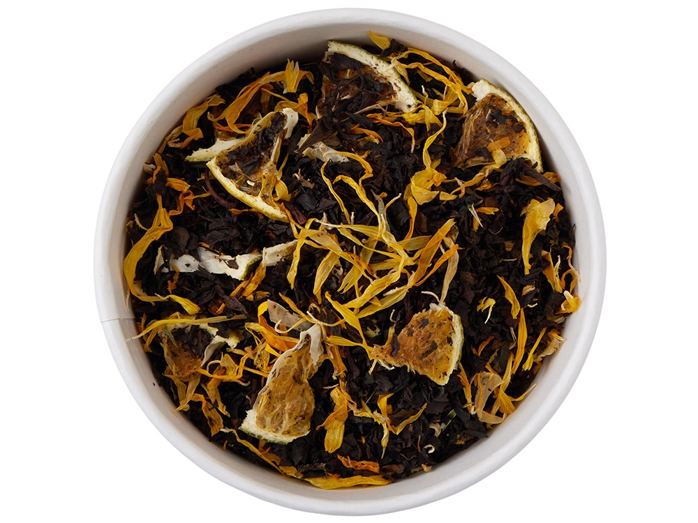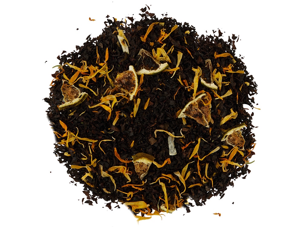 Состав черный чай, лепестки календулы, слайсы мандарина, ароматизатор натуральный Глинтвейн, ароматизатор натуральный Мандарин