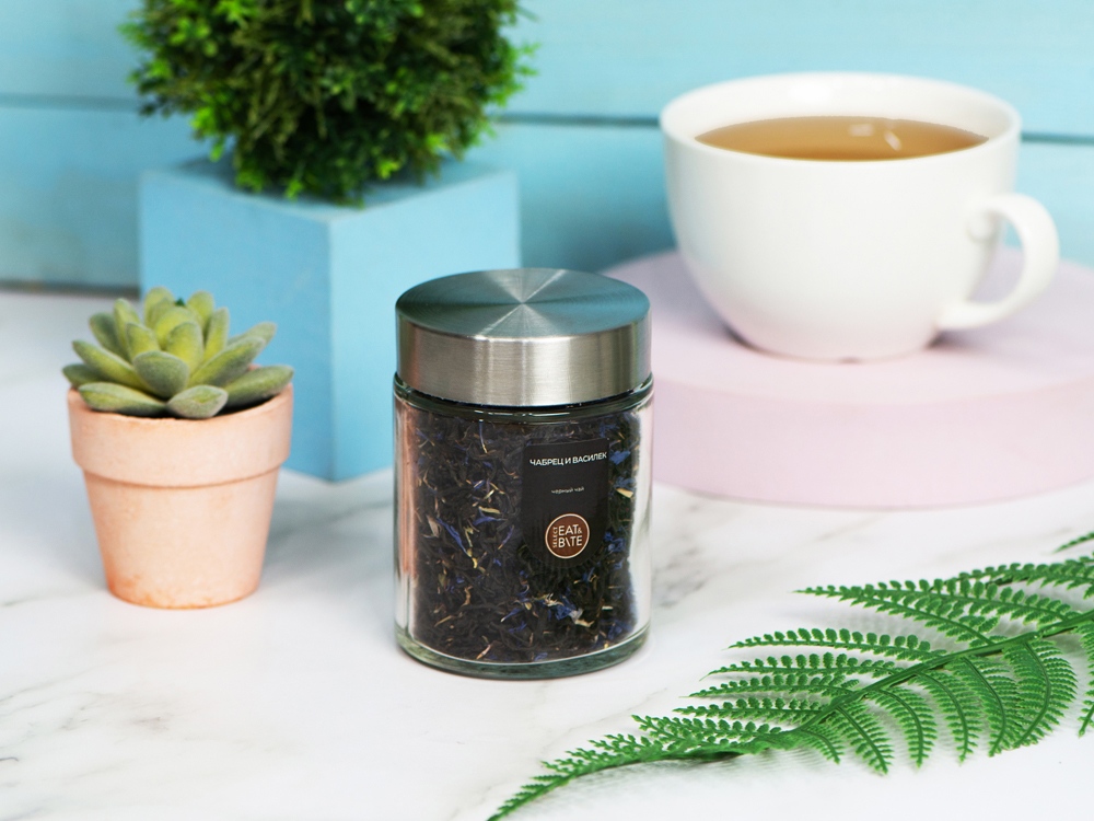 Чай черный, серия Essence, с чабрецом и лепестками василька, стеклянная банка купить оптом и в розницу с нанесением логотипа в Нижнем Новгороде