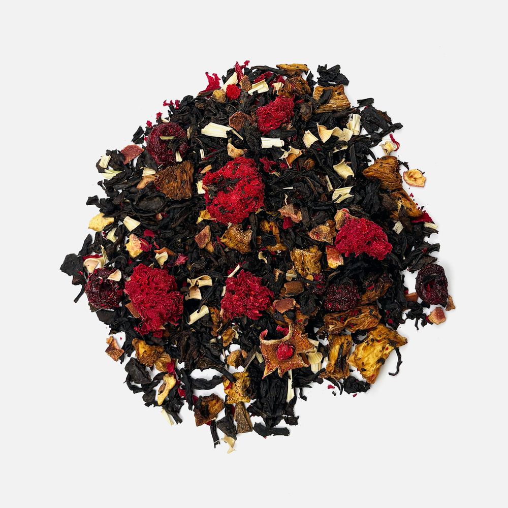 Черный крупнолистовой чай с кусочками ананаса, вишни, лемонграссом, цветками и коркой граната обладает многогранной палитрой вкуса и аромата. В состав чая входят только натуральные ингредиенты, а чайные листья предварительно вымачиваются в соке ананаса: вкус напитка становится особо насыщенным и обогащенным.