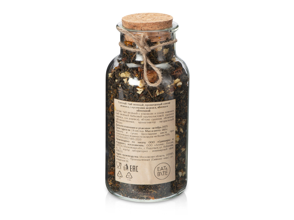 Чай с соком - натуральный, вкусный и полезный для здоровья напиток. Это не просто чай с фруктовыми кусочками и добавками, а чайные листья, наполненные соком свежайших плодов. Для изготовления 2 тонн такого чая используется 20 тонн свежих фруктов. По технологии чайные листья смешиваются с нарезанными кусочками фруктов и пропитываются выделяющимся соком. После этого вобравшие сок листья чая высушиваются и смешиваются с сублимированными ягодами или фруктами, образуя уникальный напиток. Состав: чай зелёный с ананасом и соком ананаса (чай зелёный байховый крупнолистовой, кусочки ананаса, сок ананаса), яблоко сушеное, облепиха сублимированная, ароматизатор натуральный Яблоко.