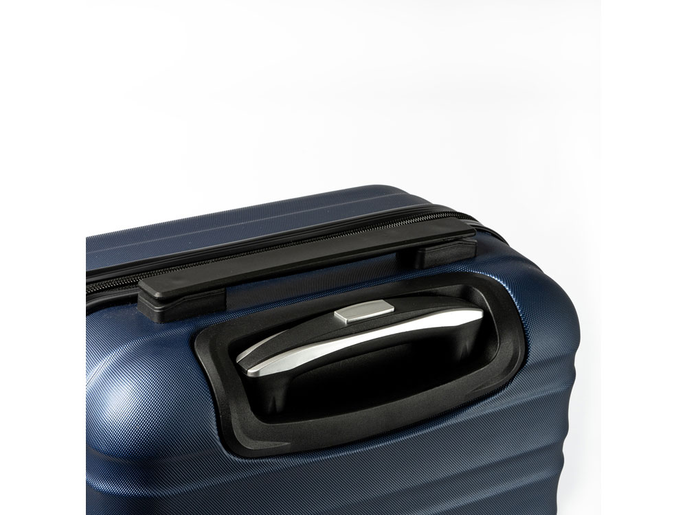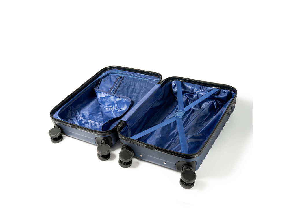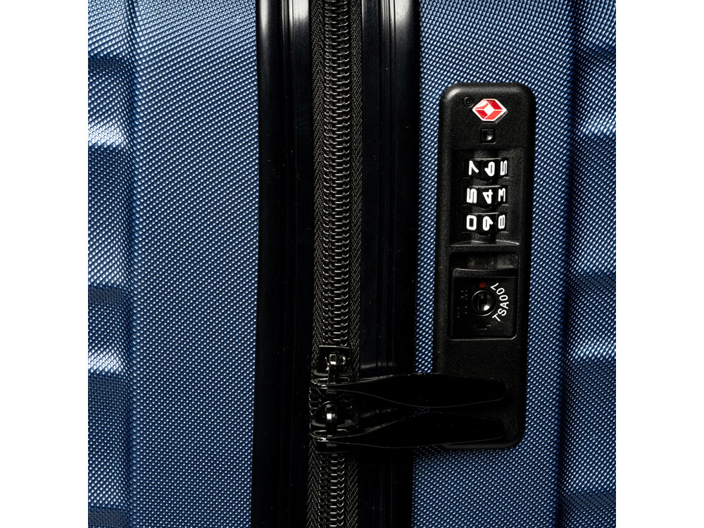 Чемодан из прочного АБС-пластика. Внутри два основных отделения и дополнительный сетчатый карман. Включает встроенный замок безопасности TSA. Поворотные колеса, облегчающие передвижение в любом направлении.