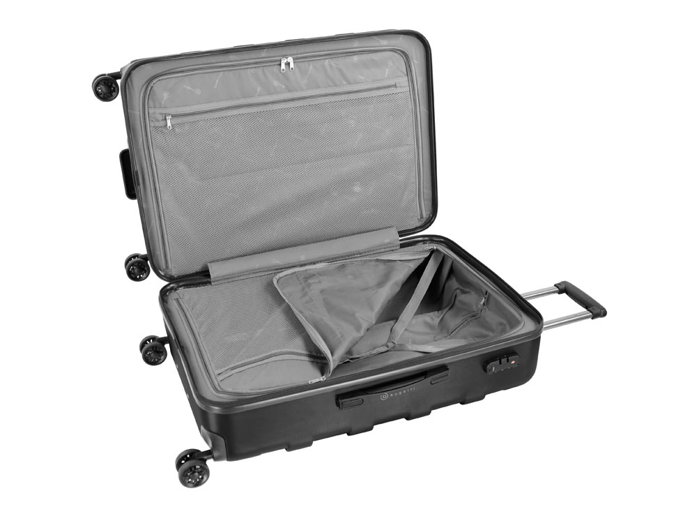 ЧЕМОДАН GALATEA Galatea - наша неповторимая серия чемоданов с рельефно нанесённым на корпус большим логотипом Bugatti. Вся товарная линейка представлена в классическом чёрном цвете. Благодаря корпусу, сделанному из смеси АБС-пластика и поликарбоната, каждая модель отличается лёгким весом и повышенной прочностью. Четыре резиновых колеса с бесшумным ходом и возможностью поворота на 360° обеспечивают ровное движение. Лёгкая телескопическая ручка эргономичной формы фиксируется в нескольких положениях для удобства пользователей с разным ростом. Замок TSA с трехзначным кодом идеально подходит для защиты содержимого багажа от несанкционированного вскрытия. Дополнительная ручка на дне корпуса облегчает загрузку и выгрузку чемодана. Сетчатые разделительные стенки на молнии растягиваются для удобства упаковки, а фиксирующие ремни охватывают большую поверхность и обеспечивают сохранность сложенных вещей. СВОЙСТВА Внутренняя организация: основное отделение на молнии с 2 отсеками, 2 сетчатыми перегородками на молнии и фиксирующими ремнями Внешняя организация: телескопическая ручка, кодовый замок TSA, 4 двойных колеса, боковая ручка, ручка на дне Размер: 46 x 27,5 x 67 см Объём: 65 л Вес: 3,62 кг Материал: поликарбонат / АБС-пластик