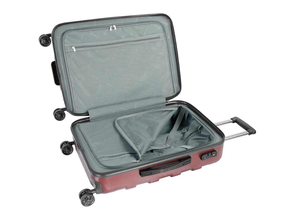 ЧЕМОДАН GALATEA Galatea - наша неповторимая серия чемоданов с рельефно нанесённым на корпус большим логотипом Bugatti. Вся товарная линейка представлена в классическом черном и бордовом цветах. Благодаря корпусу, сделанному из смеси АБС-пластика и поликарбоната, каждая модель отличается лёгким весом и повышенной прочностью. Четыре резиновых колеса с бесшумным ходом и возможностью поворота на 360° обеспечивают ровное движение. Лёгкая телескопическая ручка эргономичной формы фиксируется в нескольких положениях для удобства пользователей с разным ростом. Замок TSA с трехзначным кодом идеально подходит для защиты содержимого багажа от несанкционированного вскрытия. Дополнительная ручка на дне корпуса облегчает загрузку и выгрузку чемодана. Сетчатые разделительные стенки на молнии растягиваются для удобства упаковки, а фиксирующие ремни охватывают большую поверхность и обеспечивают сохранность сложенных вещей. СВОЙСТВА Внутренняя организация: основное отделение на молнии с 2 отсеками, 2 сетчатыми перегородками на молнии и фиксирующими ремнями Внешняя организация: телескопическая ручка, кодовый замок TSA, 4 двойных колеса, боковая ручка, ручка на дне Размер: 46 x 27,5 x 67 см Объём: 65 л Вес: 3,62 кг Материал: поликарбонат / АБС-пластик