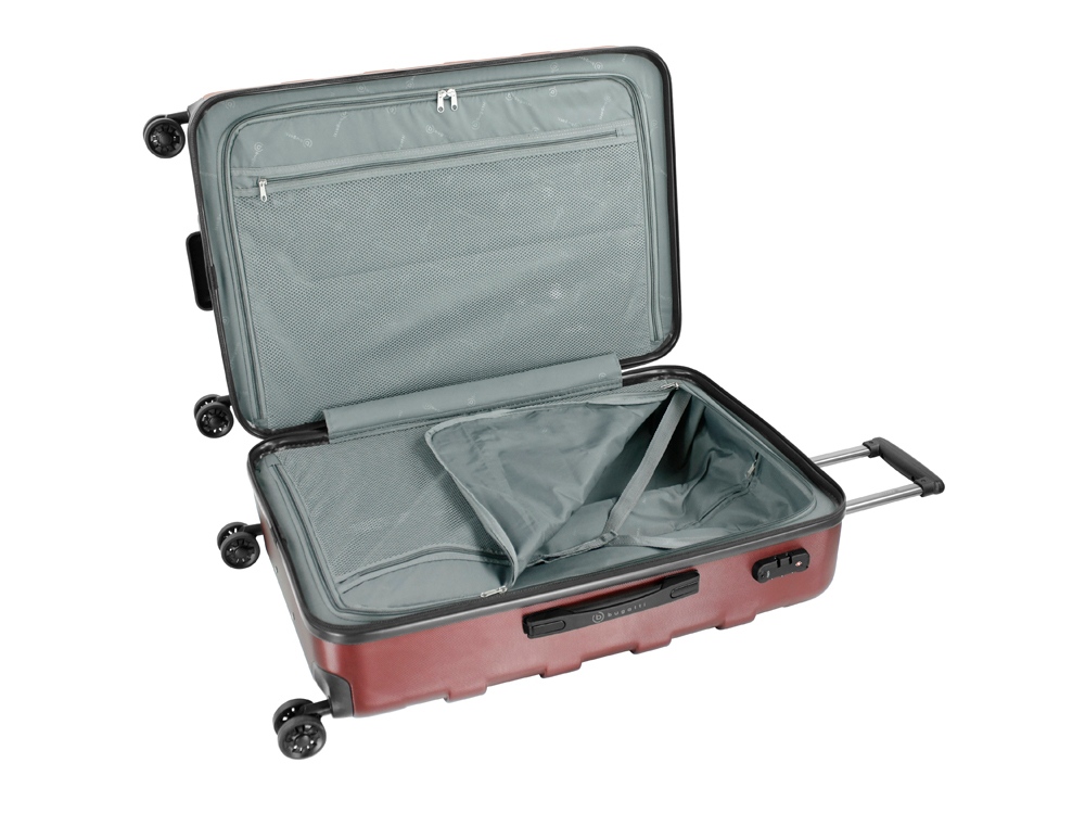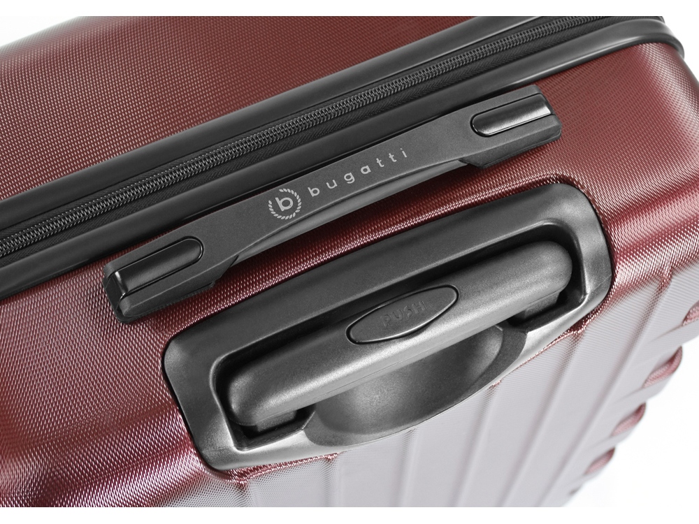 ЧЕМОДАН GALATEA Galatea - наша неповторимая серия чемоданов с рельефно нанесённым на корпус большим логотипом Bugatti. Вся товарная линейка представлена в классическом чёрном и бордовом цветах. Благодаря корпусу, сделанному из смеси АБС-пластика и поликарбоната, каждая модель отличается лёгким весом и повышенной прочностью. Четыре резиновых колеса с бесшумным ходом и возможностью поворота на 360° обеспечивают ровное движение. Лёгкая телескопическая ручка эргономичной формы фиксируется в нескольких положениях для удобства пользователей с разным ростом. Замок TSA с трехзначным кодом идеально подходит для защиты содержимого багажа от несанкционированного вскрытия. Дополнительная ручка на дне корпуса облегчает загрузку и выгрузку чемодана. Сетчатые разделительные стенки на молнии растягиваются для удобства упаковки, а фиксирующие ремни охватывают большую поверхность и обеспечивают сохранность сложенных вещей. СВОЙСТВА Внутренняя организация: основное отделение на молнии с 2 отсеками, 2 сетчатыми перегородками на молнии и фиксирующими ремнями Внешняя организация: телескопическая ручка, кодовый замок TSA, 4 двойных колеса, боковая ручка, ручка на дне Размер: 53 x 30,5 x 77 см Объём: 96 л Вес: 4,26 кг Материал: поликарбонат / АБС-пластик