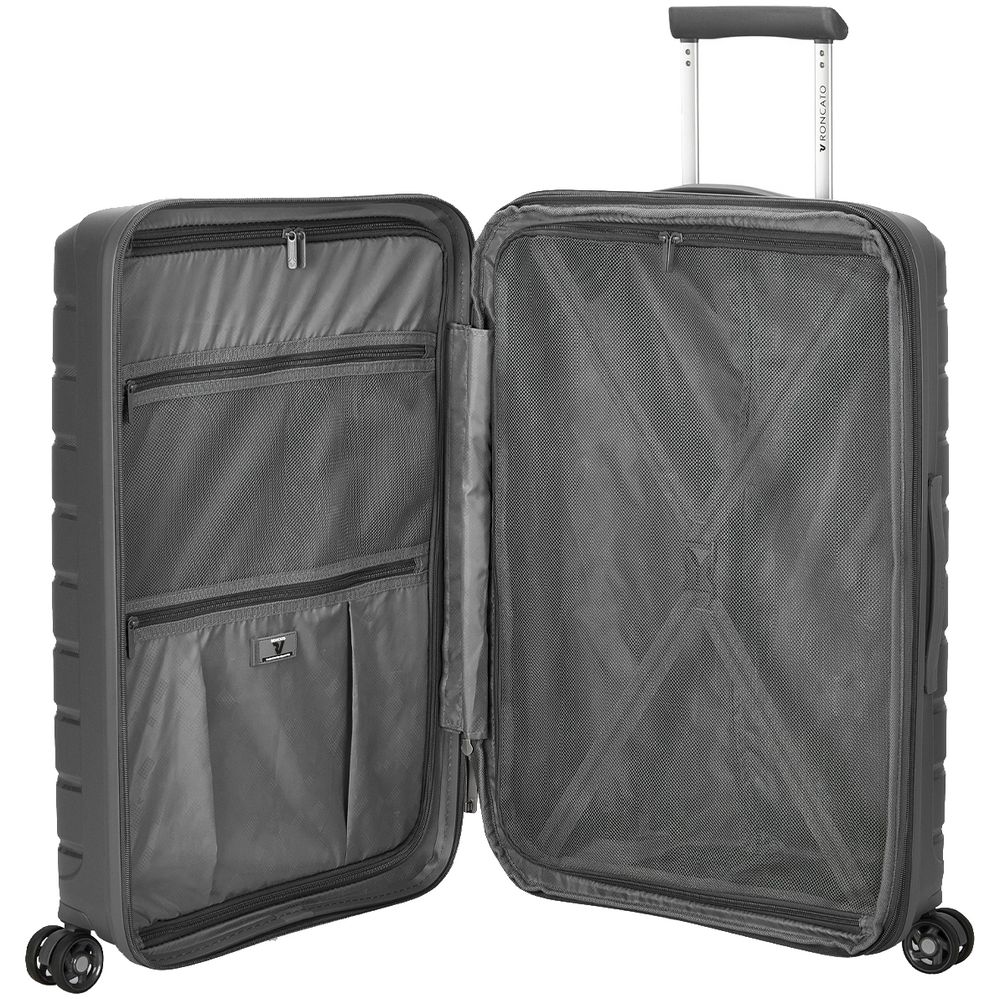 • Чемодан с 2 отделениями: одно отделение с сетчатым разделителем и прижимными ремнями, а второе оснащено перегородкой на молнии с двумя карманами