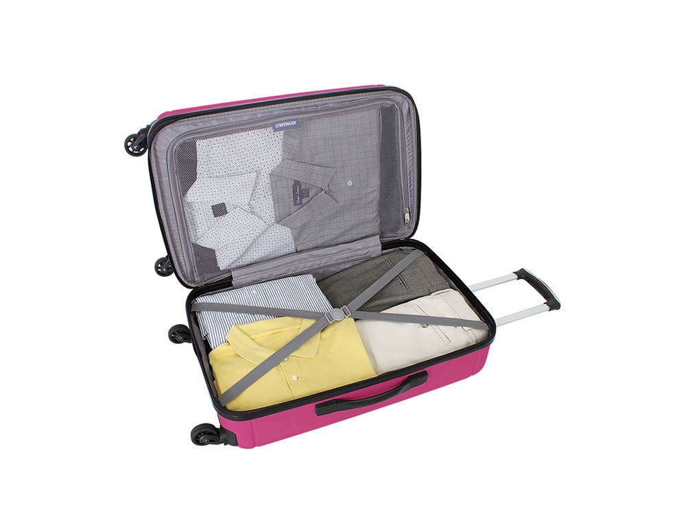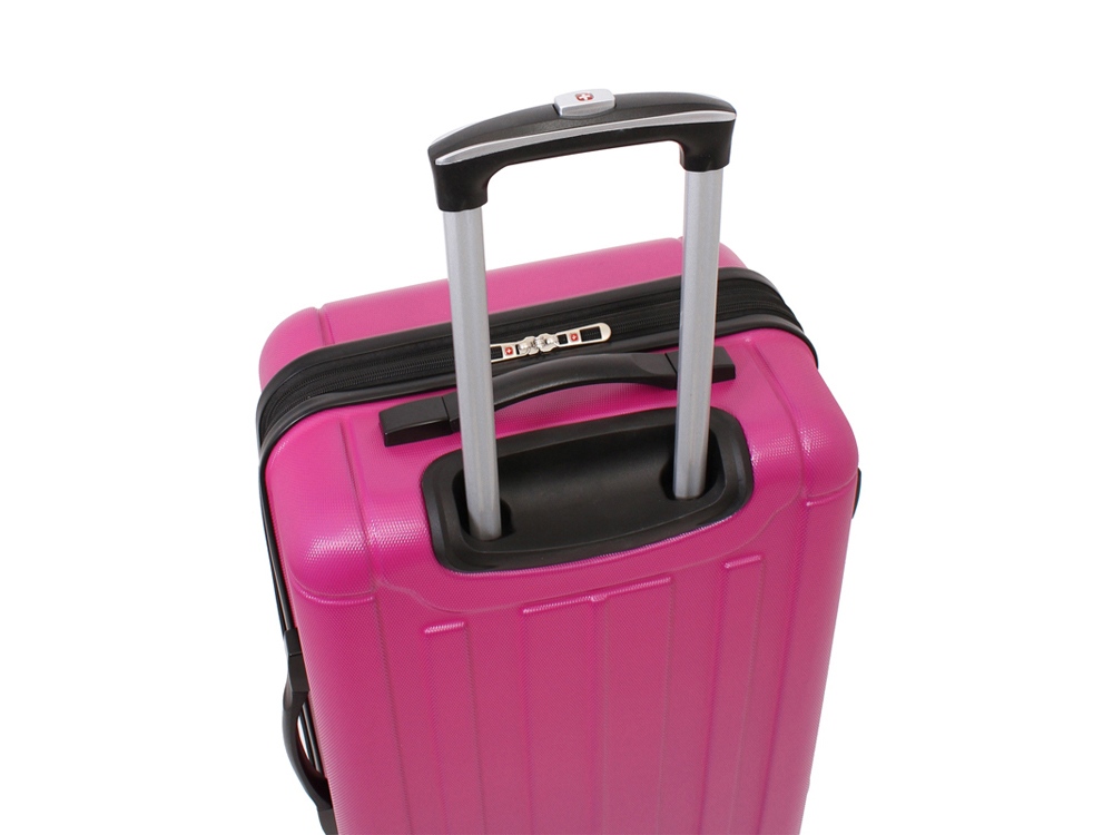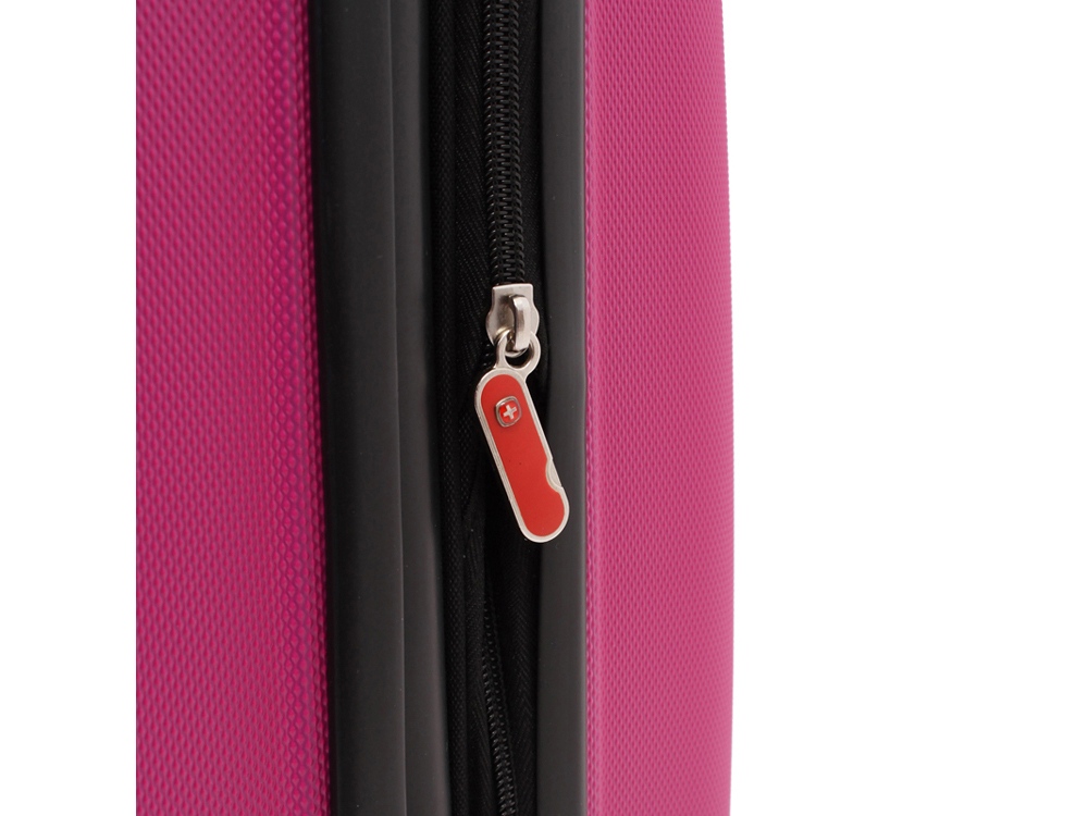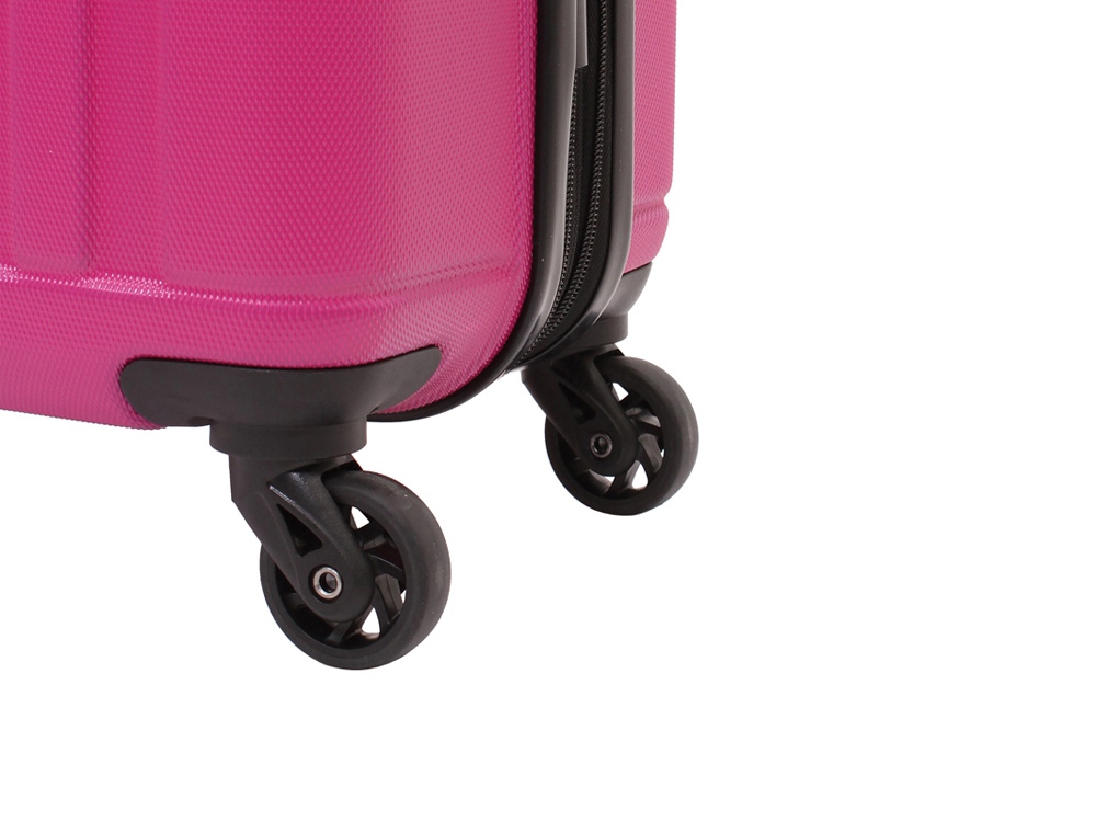 Корпус чемодана выполнен из специального пластика повышенной прочности (АБС-пластик), имеет хорошую противоударную устойчивость. Внутреннее отделение разделено на отсеки: имеются два отсека повышенной вместительности для основных вещей – нижний, с х-образной резинкой-фиксатором и верхний отдел с эластичной сеткой – для дополнительных вещей, с закрывающимся карманом на молнии. Также предусмотрен карман для полезных мелочей. Вместительность чемодана может быть дополнительно увеличена на 6 см. Чемодан легко перемещается при помощи четырех колес вращающихся на 360 градусов и телескопическая ручка из алюминия с функцией фиксации складывается в специальный отсек. На внешних сторонах имеются эргономичные ручки: для верхнего и бокового захвата, также предусмотрены боковые ножки для бокового хранения чемодана. Чемодан закрывается на двустороннюю молнию, бегунки с функцией крепления замка.