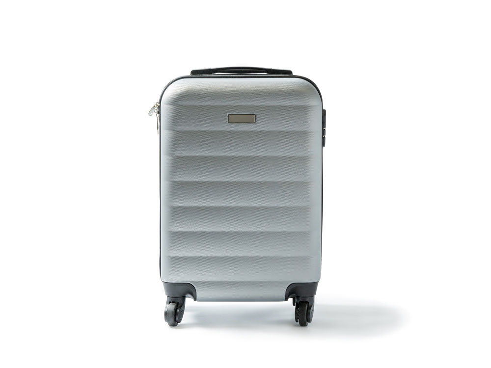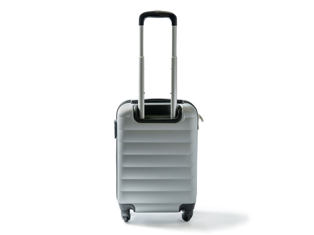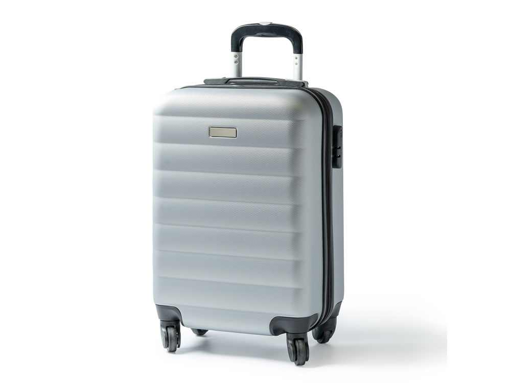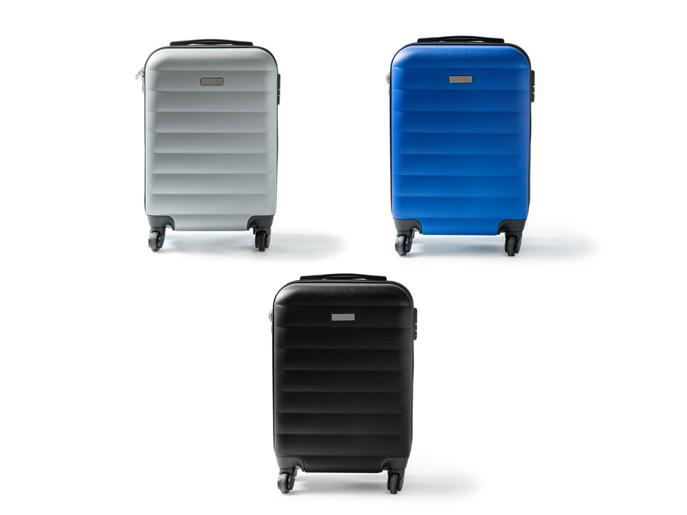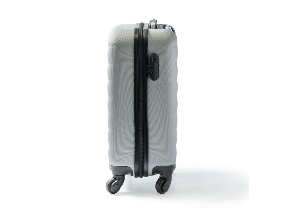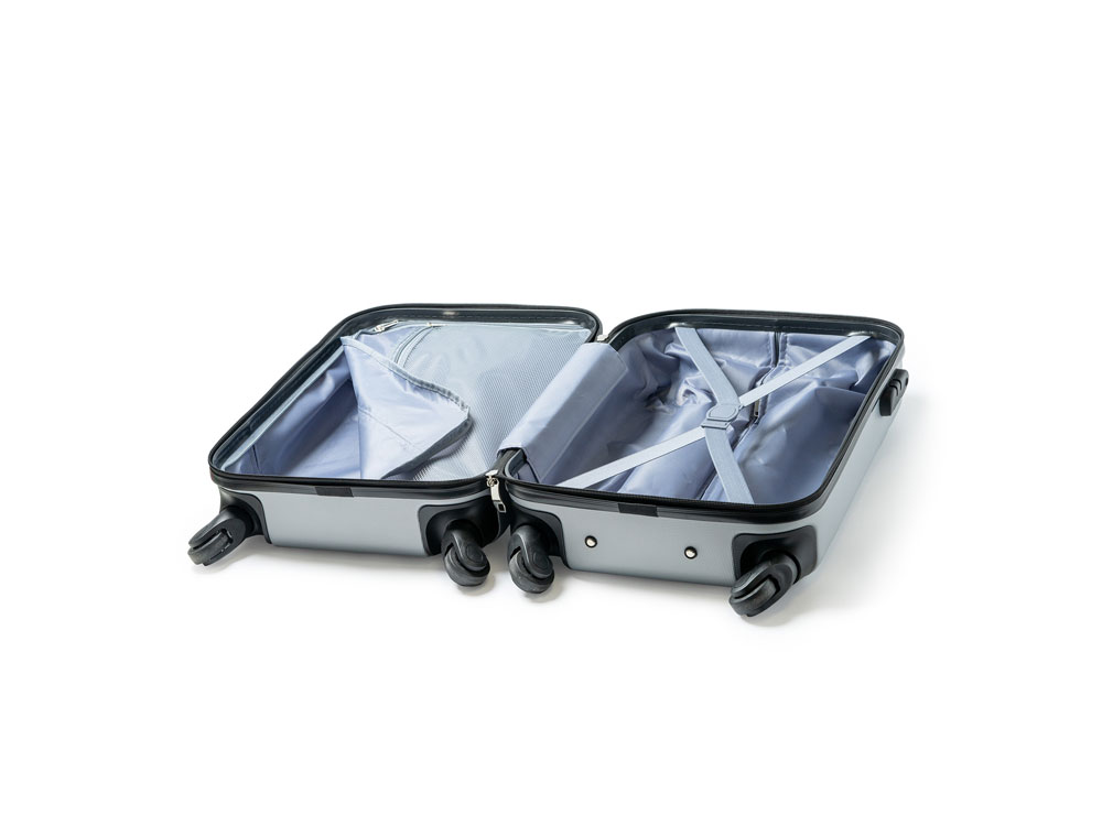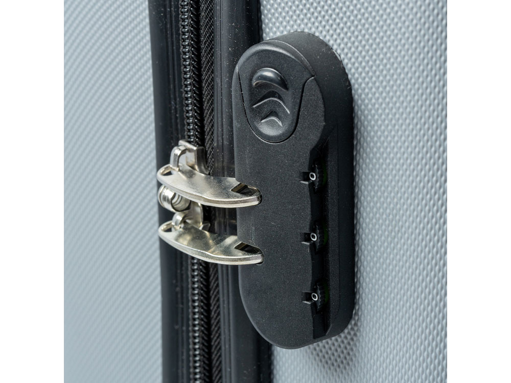 Чемодан из прочного АБС-пластика. Внутри два основных отделения и дополнительный сетчатый карман. Включает встроенный замок безопасности.