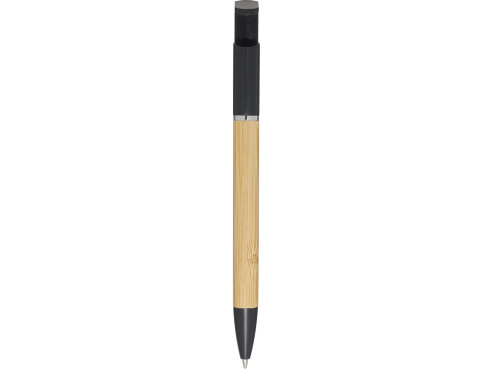 Бамбуковая шариковая ручка, которая также может служить подставкой для телефона. Кнопка и среднее кольцо изготовлены из переработанного пластика, наконечник — из латуни, а корпус — из бамбука, полученного из ответственных источников. Цвет чернил: синий. Длина непрерывной линии: 1000 метров. Размер пера: 1,0 мм. FSC certified bamboo. FSC Mix Credit N5 CU-COC-877277.