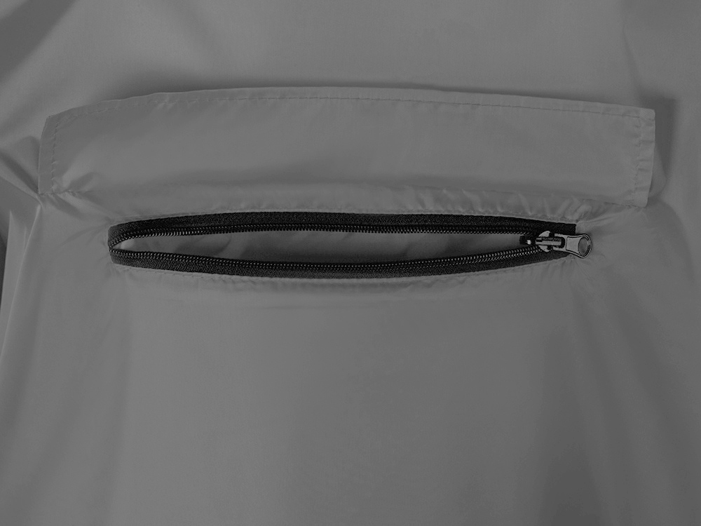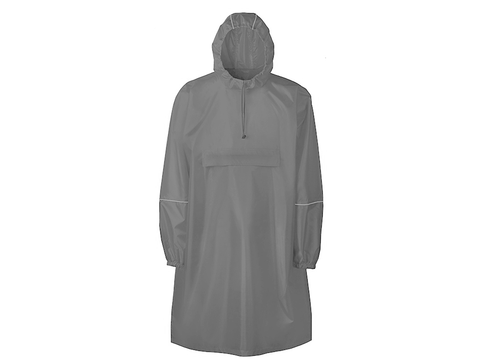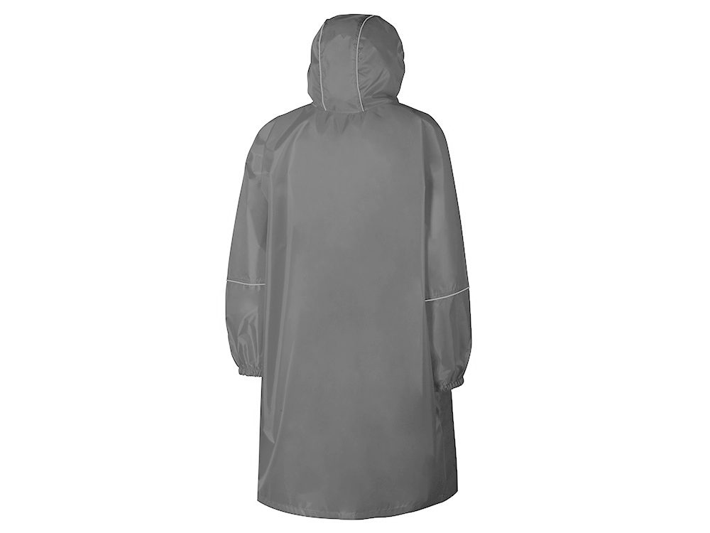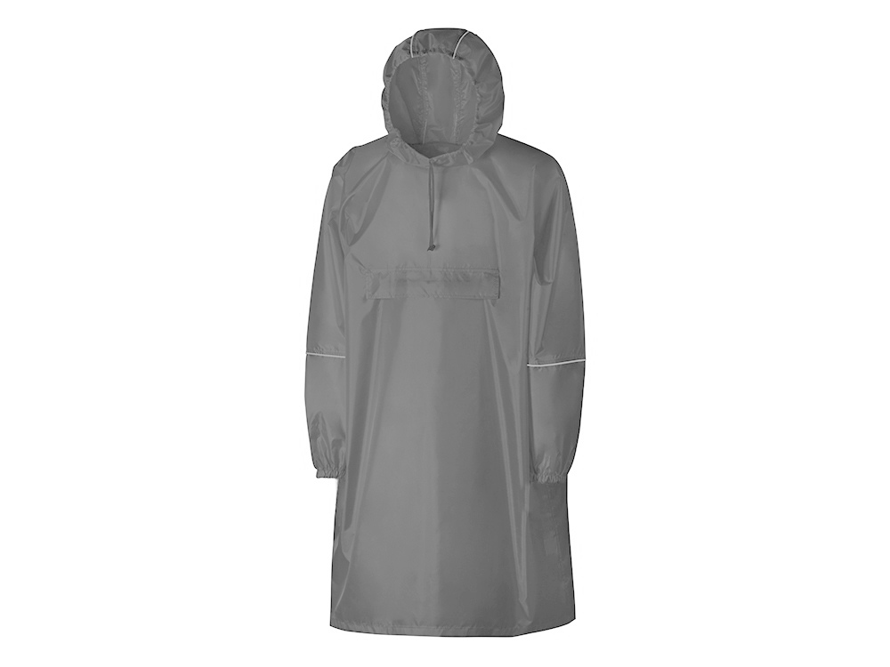 Дождевик - пончо прямого силуэта. Нагрудный карман плаща закрывается на молнию, которая дополнительно защищена клапаном, а еще в него можно полностью убрать дождевик. На дне кармана — ручка-петелька, которая в сложенном виде может использоваться для подвешивания. Швы капюшона и рукавов отделаны светоотражающим кантом, который делает человека заметным даже в темное время суток. Для комфортной посадки — затягивающийся на шнурок капюшон с фиксатором и манжеты на резинке.