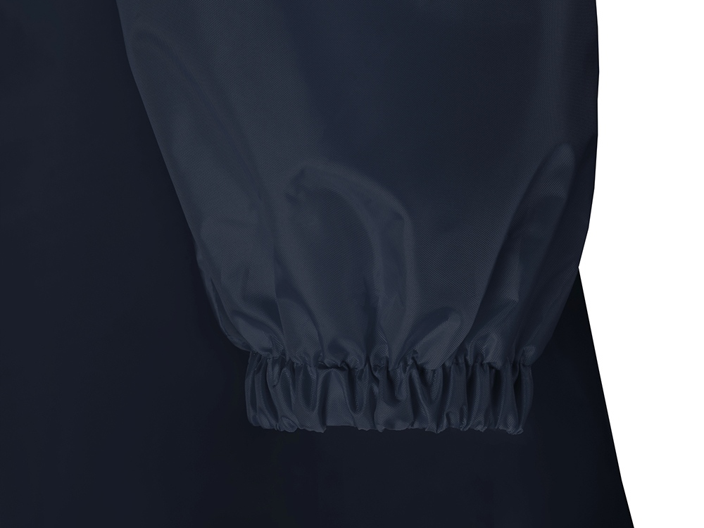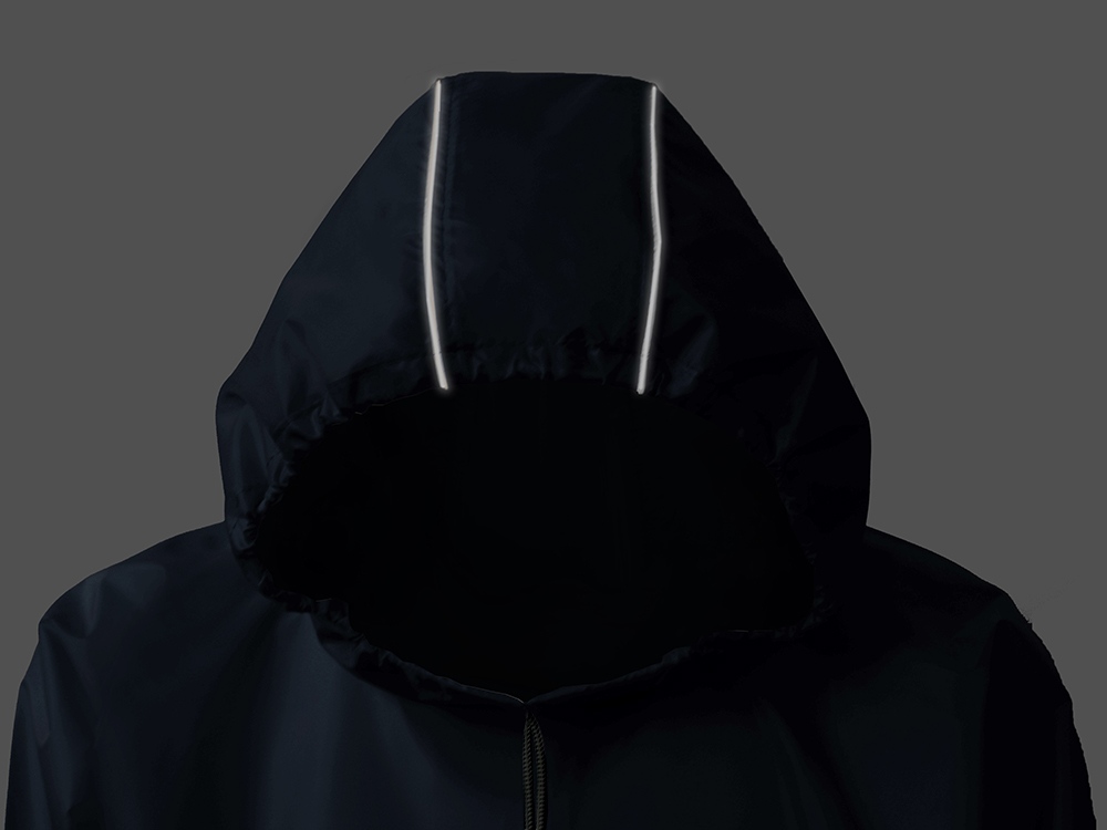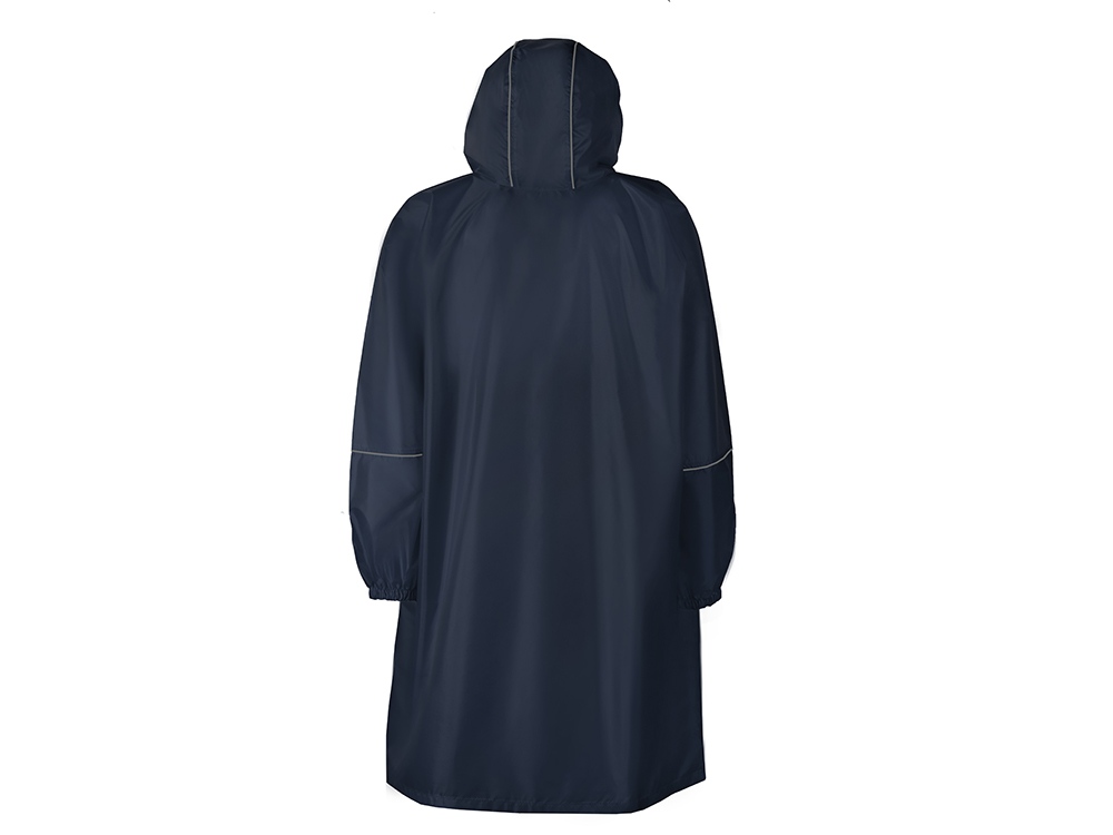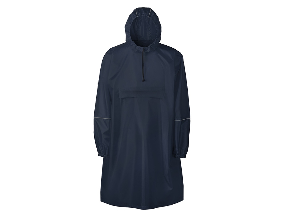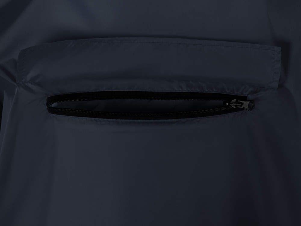 Дождевик - пончо прямого силуэта. Нагрудный карман плаща закрывается на молнию, которая дополнительно защищена клапаном, а еще в него можно полностью убрать дождевик. На дне кармана — ручка-петелька, которая в сложенном виде может использоваться для подвешивания. Швы капюшона и рукавов отделаны светоотражающим кантом, который делает человека заметным даже в темное время суток. Для комфортной посадки — затягивающийся на шнурок капюшон с фиксатором и манжеты на резинке.