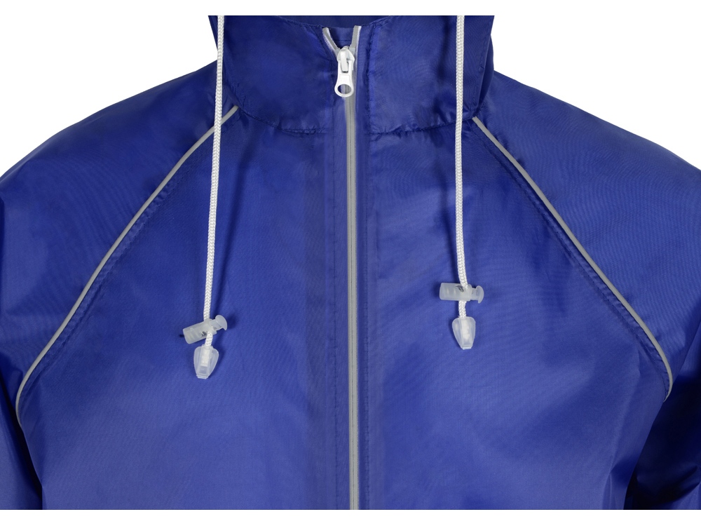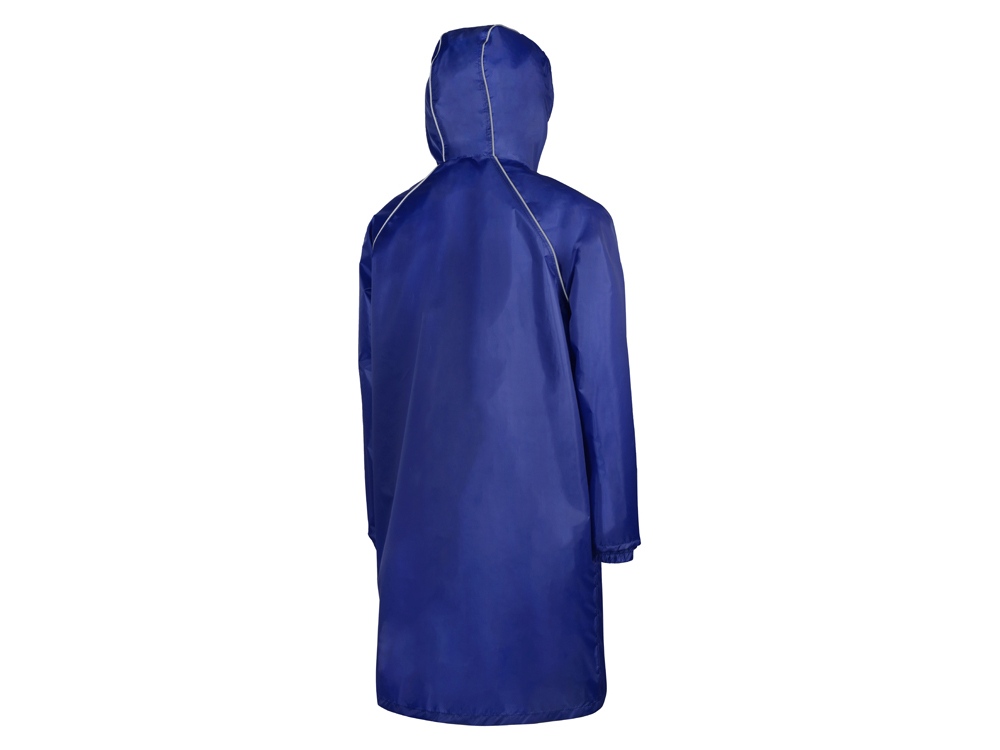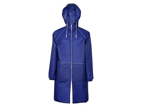Плащ-дождевик прямого силуэта с капюшоном и рукавом реглан. Застегивается на центральную молнию со светоотражающей полосой с внутренней ветрозащитной планкой. Накладные карманами с клапанами. Двухшовный капюшон с кулиской по краю. Низ рукавов обработан манжетами с внутренней резинкой для комфортной посадке в области запястья. Верхний край клапана кармана, швы капюшона, а также регланные линии обработаны светоотражающим кантом. Поставляется в чехле-мешочке на шнурке для компактного хранения.