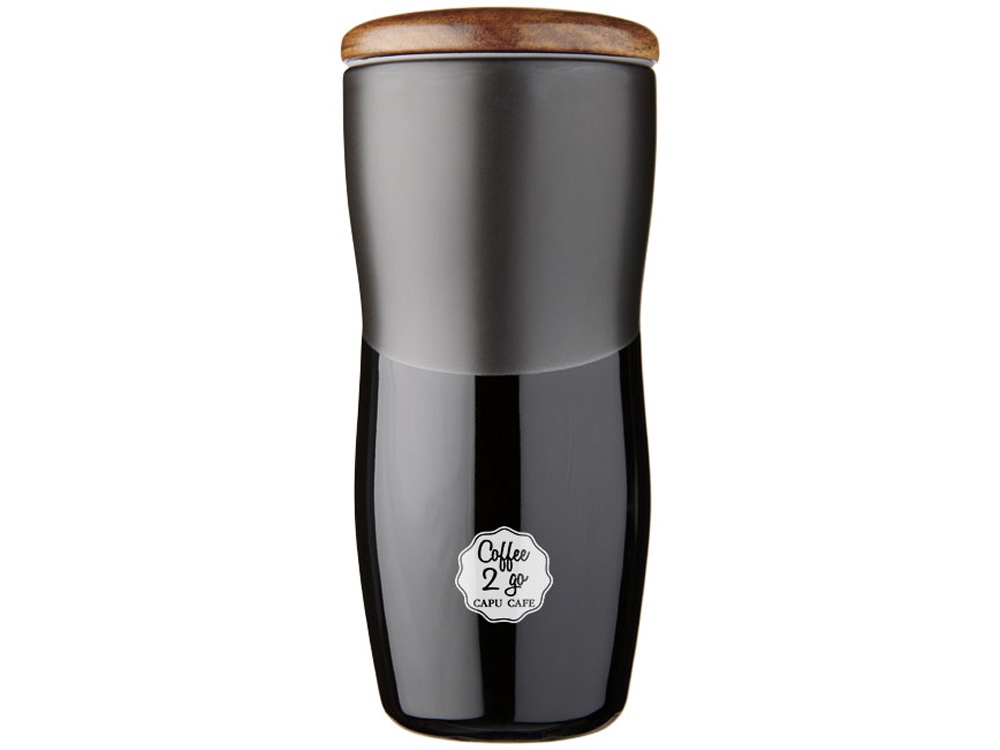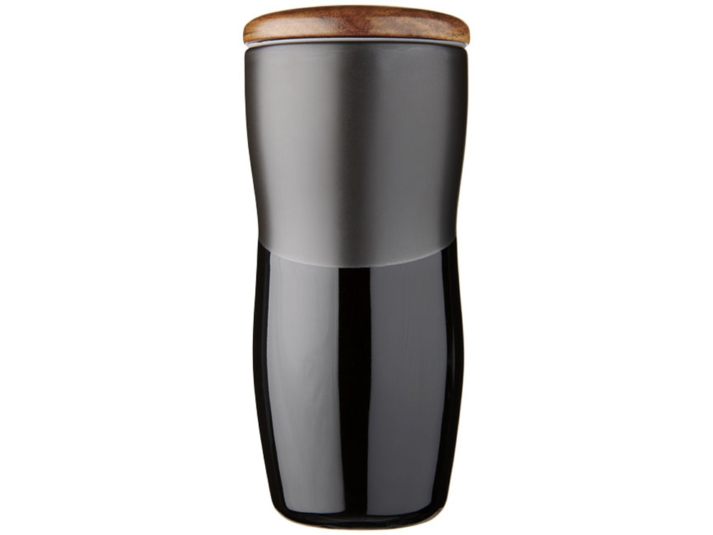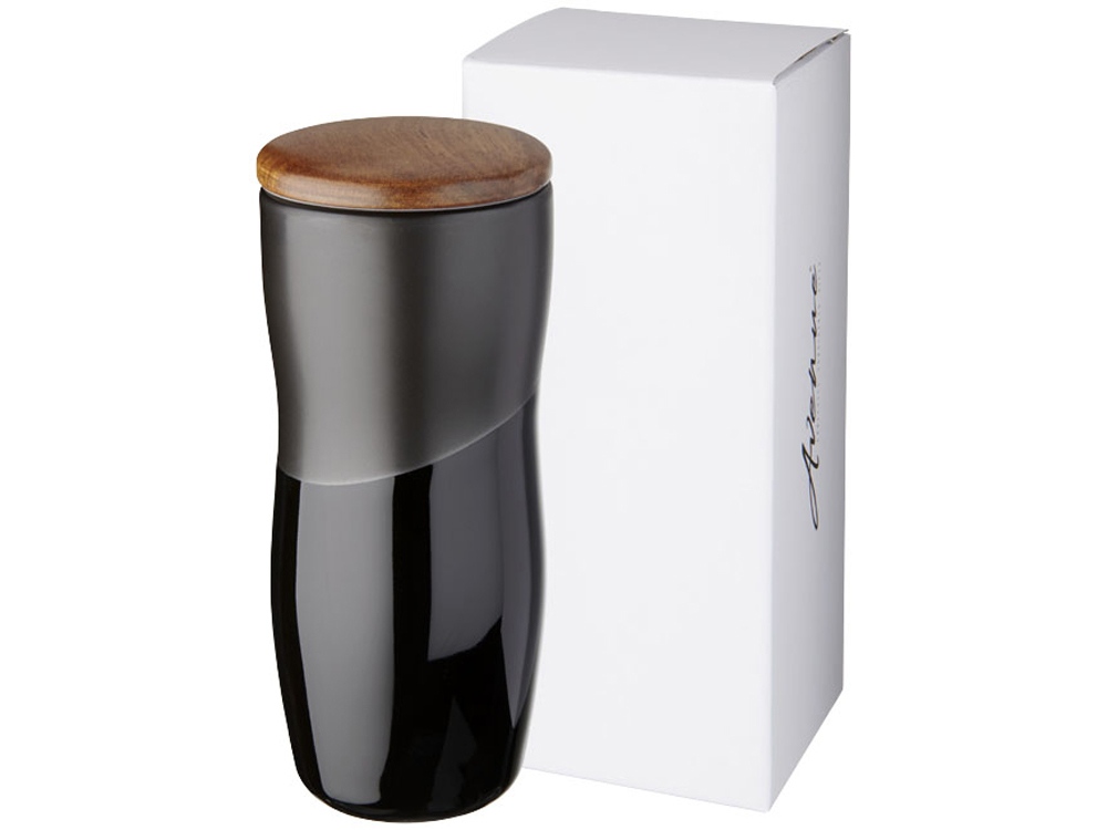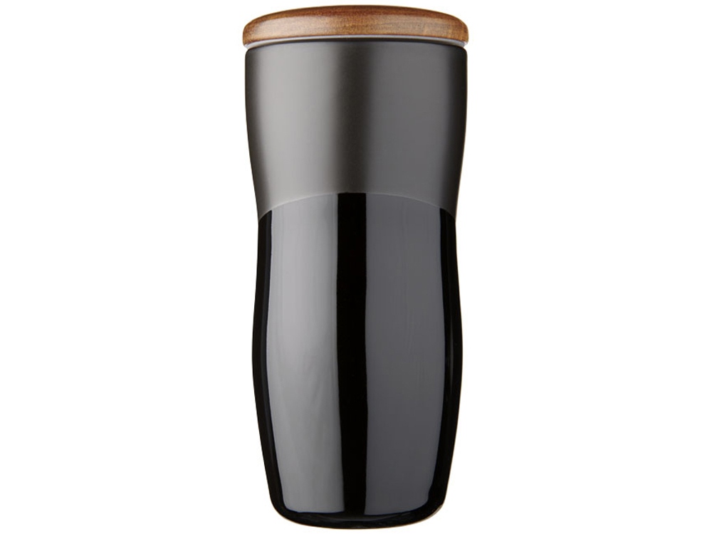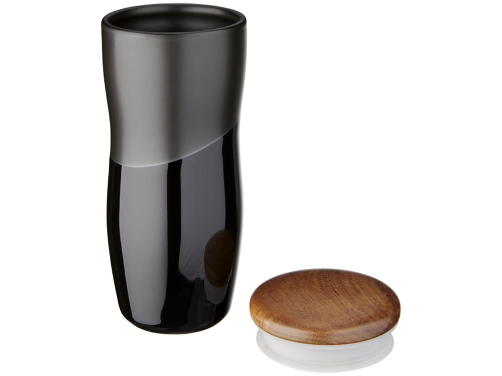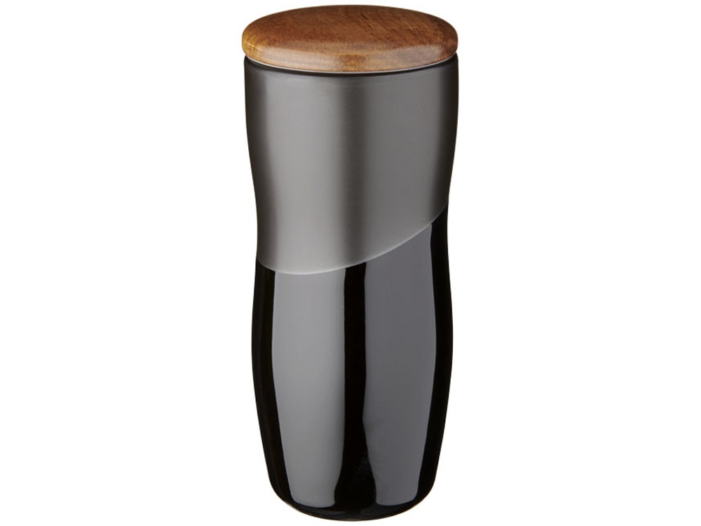 Двустенная керамическая термокружка Reno объемом 370 мл. Двустенная керамическая термокружка с контрастным дизайном из матового и блестящего покрытия. Кроме того, двустенная керамическая конструкция препятствует образованию конденсата на внешней стороне стакана. Оснащена деревянной нажимной крышкой. Номинальный объем кружки 370 мл, при использовании крышки максимальный полезный объем составит 335 мл.
