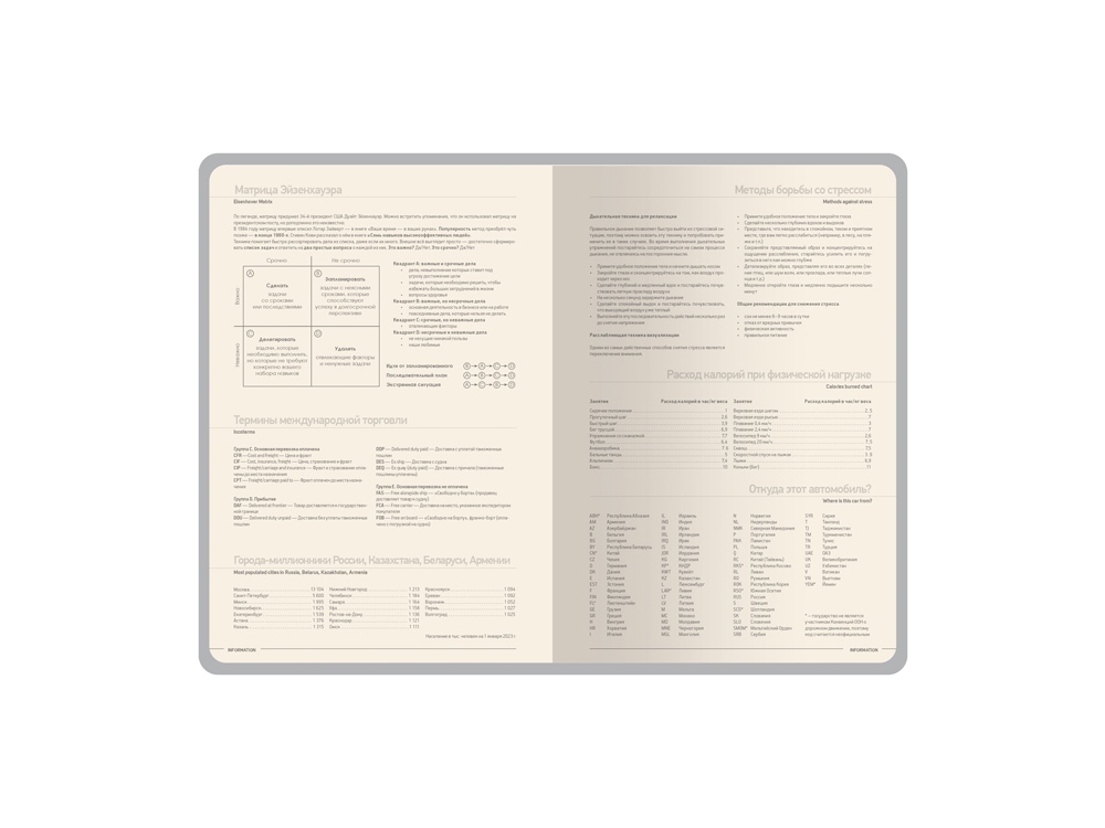 Датированный ежедневник Megapolis Loft формата А5 от Bruno Visconti - это не просто инструмент для планирования, а стильный аксессуар, который подчеркнет вашу индивидуальность. Твердая обложка из высококачественной экокожи максимально повторяет фактуру натуральной кожи. Скругленные углы блока и обложки позволяют уберечь листы от замятий и придают ежедневнику утонченности и благородства. Для удобства навигации предусмотрена закладка-ляссе в цвет обложки. Внутренний блок выполнен из бежевой бумаги плотностью 70 г/кв.м и содержит 14 страниц справочной информации, а также датированные страницы с почасовой разметкой.