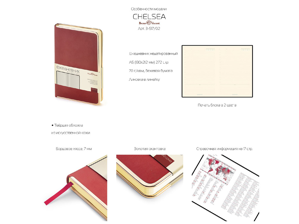Недатированный ежедневник Chelsea от бренда Bruno Visconti - это качественный корпоративный подарок по выгодной цене, произведенный специально под персонализацию. Представлен в универсальном формате А5. Деловой аксессуар, напоминающий об эпохе расцвета Голливуда, в элегантной неповторимой манере преподносит привычные классические формы. Твердая обложка оформлена металлическим кантом по всему периметру. С ним хорошо сочетается металлизированный обрез. В ежедневнике Chelsea есть полезная справочная информация и телефонная книга, а также 272 страницы для записи идей, мыслей и составления рабочих планов. Есть закладка - тесьма из шелка, она интегрирована в обложку и может использоваться как хлястик. Для изготовления страниц используется качественный бежевый офсет повышенной плотности (70 г/кв м), которая производится в Японии и подходит для всех видов чернил. Бордовое ляссе, совпадающее по цвету с капталом, служит для удобного перехода к текущей дате. Все ежедневники от бренда Bruno Visconti можно персонализировать с помощью тиснения обложки - золотой или серебрянной фольгой. Наши ежедневники помогут быть успешным и эффективным в карьере и повседневной жизни!