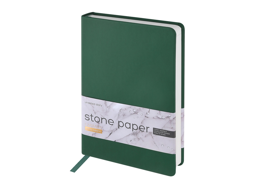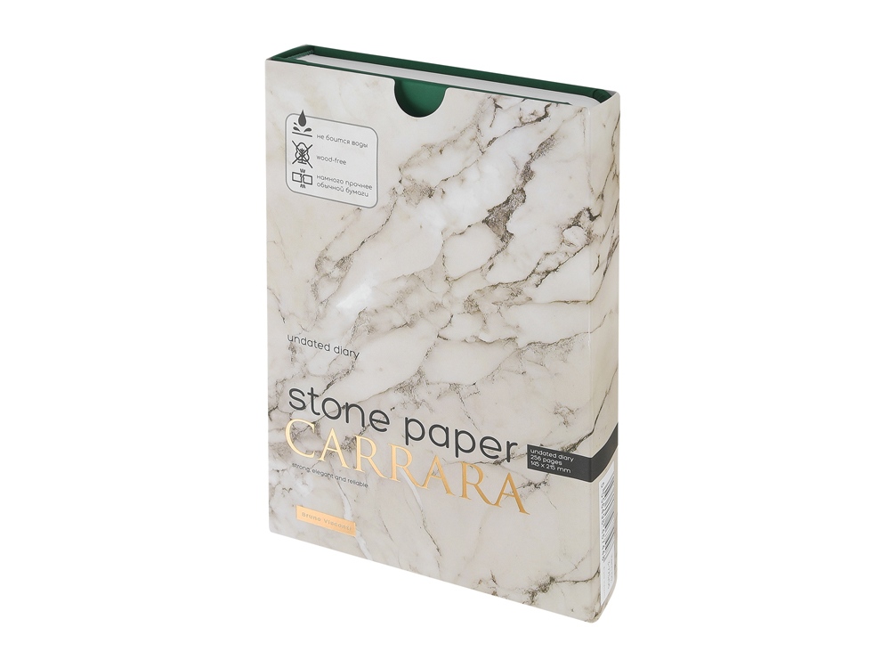 Уникальность недатированного ежедневника Carrara от Bruno Visconti — в его блоке. Он изготовлен из каменной бумаги плотностью 144 г/кв.м, отличающейся особой гладкостью и повышенной прочностью. Она не боится воды и пролитого кофе, достаточно просто протереть сухой салфеткой. Раздел для записей и планирования рабочих и личных дел дополнен справочной информацией на 15 страницах. Блок надежно защищен от замятия твердой обложкой из искусственной кожи с Soft Touch покрытием. Ляссе в цвет обложки шириной 7 мм поможет легко и быстро найти нужную страницу.