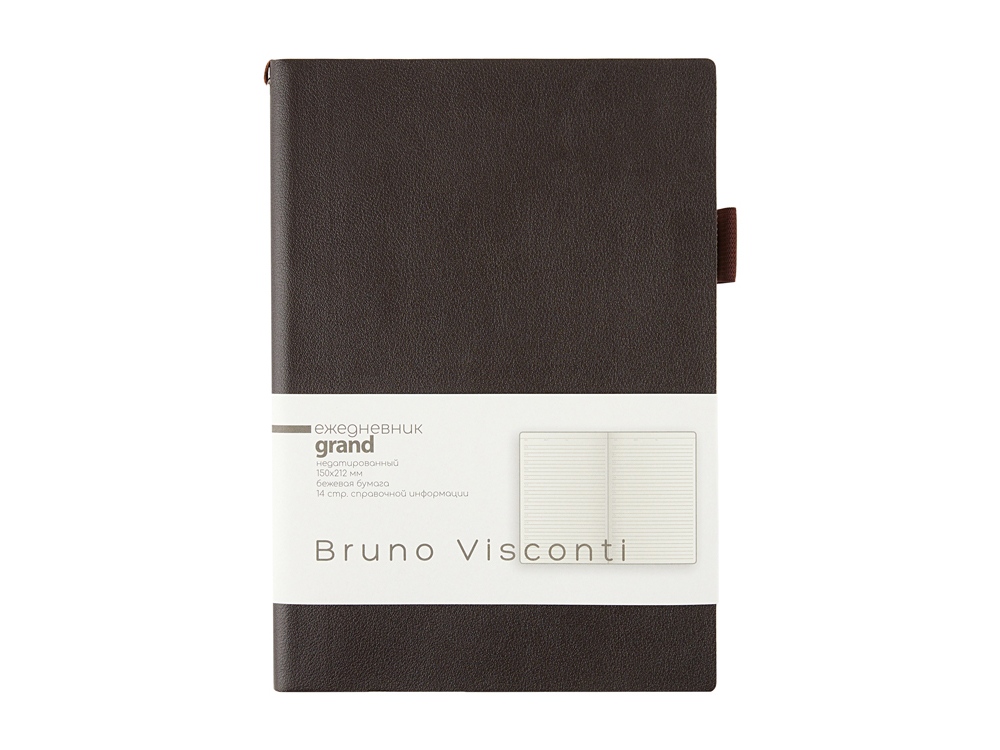 Мягкая, гибкая обложка с необычной фактурой, приятной на ощупь, петля под ручку, двойное ляссе, стандартный формат А5 — все это ежедневник Grand. А благодаря оригинальному способу фиксации ляссе на корешке ежедневник получил новое звучание. Такая фишка придется по вкусу всем, кто придает большое значение деталям. Недатированный блок изготовлен из бежевой бумаги плотностью 80 г/кв.м. Ежедневник имеет справочную информацию на 14 страницах.