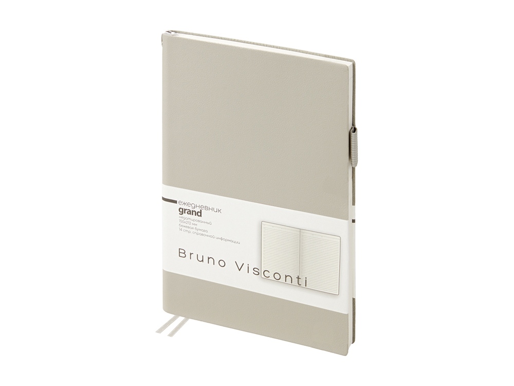 Мягкая, гибкая обложка с необычной фактурой, приятной на ощупь, петля под ручку, двойное ляссе, стандартный формат А5 — все это ежедневник Grand. А благодаря оригинальному способу фиксации ляссе на корешке ежедневник получил новое звучание. Такая фишка придется по вкусу всем, кто придает большое значение деталям. Недатированный блок изготовлен из бежевой бумаги плотностью 80 г/кв.м. Ежедневник имеет справочную информацию на 14 страницах.