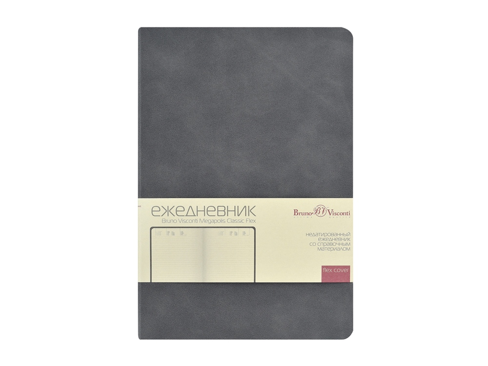 Классическое воплощение минимализма: формат А5, гибкая обложка, скругленный угол блока и обложки, ровные, четкие линии, отсутствие декоративных элементов. Внутренний блок изготовлен из бежевой бумаги плотностью 70 г/м2 и, помимо раздела для планирования рабочего времени, включает в себя 12 страниц справочной информации. Функциональность и эргономичность — это то, что отличает недатированный ежедневник Megapolis Classic Flex ТМ Bruno Visconti от всех других ежедневников.