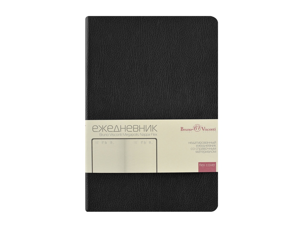 Обложка недатированного ежедневника Megapolis Nappa Flex ТМ Bruno Visconti произведена из искусственной кожи без применения переплетного картона, благодаря чему он легче и изящнее классических. Его можно свернуть в трубочку, обложка и блок не пострадают. При этом, для ежедневника формата А5 доступны те же опции, что и для любых других ежедневников — окрашенный обрез, крупнозернистая фактура искусственной кожи обложки, двойное ляссе 7 мм. Блок изготовлен из бежевой бумаги плотностью 70 г/м2 и помимо раздела для планирования рабочего времени включает в себя 12 страниц справочной информации.