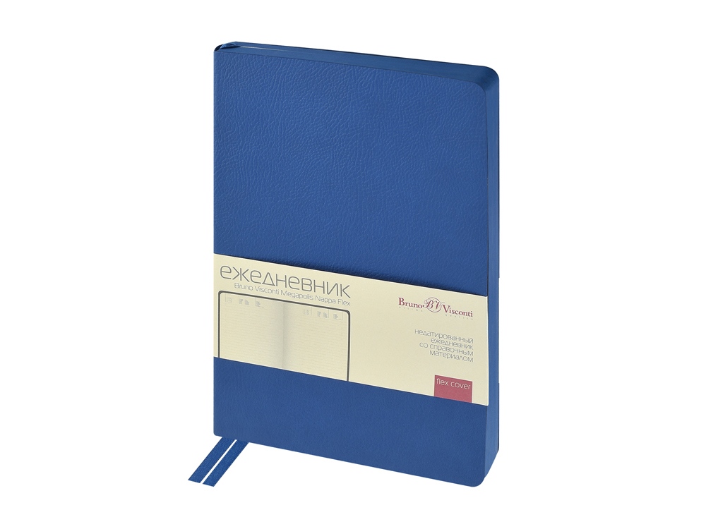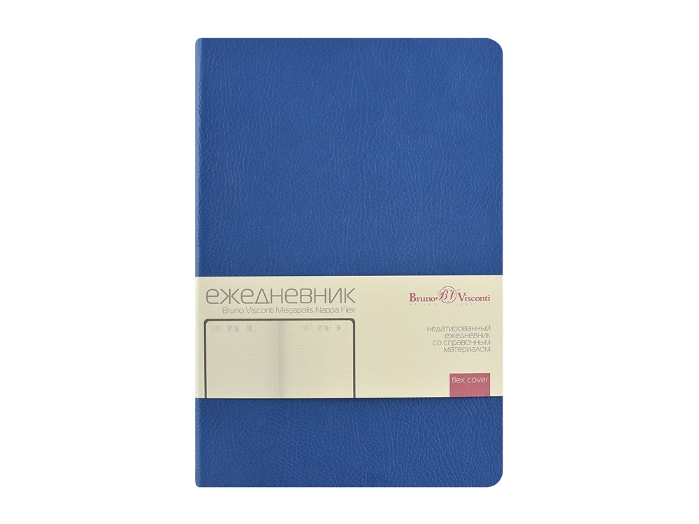 Обложка недатированного ежедневника Megapolis Nappa Flex ТМ Bruno Visconti произведена из искусственной кожи без применения переплетного картона, благодаря чему он легче и изящнее классических. Его можно свернуть в трубочку, обложка и блок не пострадают. При этом, для ежедневника формата А5 доступны те же опции, что и для любых других ежедневников — окрашенный обрез, крупнозернистая фактура искусственной кожи обложки, двойное ляссе 7 мм. Блок изготовлен из бежевой бумаги плотностью 70 г/м2 и помимо раздела для планирования рабочего времени включает в себя 12 страниц справочной информации.