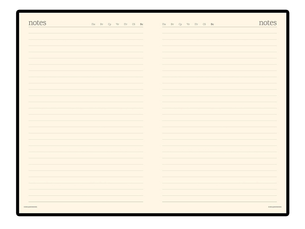 Ежедневник выпускается в универсальном формате А5. Размер обложки – 144*215 мм. В недатированном блоке для записей 320 страниц из тонированной бумаги бежевого цвета. Бумага плотностью 70 грамм. На 16 листах представлен значительный объем справочной информации на русском языке, полезной для бизнеса и повседневной жизни. Дни недели указаны сокращенно на русском языке. Отрывные листы, дополненные микроперфорацией, расположены в конце ежедневника.