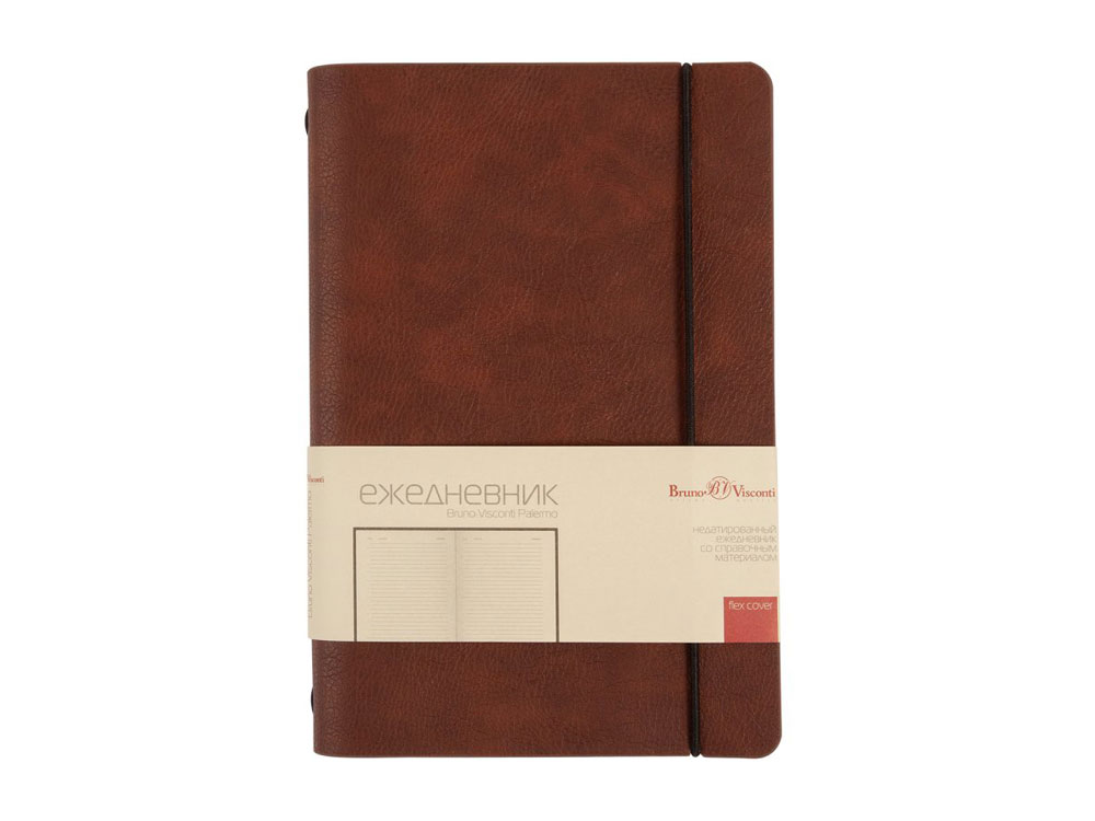 Недатированный ежедневник Bruno Visconti Palermo формата А5 с гибкой (flex) обложкой – практичный помощник в деле планирования рабочего времени для деловых людей, живущих в ритме мегаполиса. Отличительной особенностью ежедневника является горизонтальная, скрепляющая обложку и блок, тоненькая резинка. Оригинальное решение позволяет раскрывать ежедневник на 180 градусов и вести записи у самого края корешка. Для фиксации второй резинки, не позволяющей ежедневнику раскрываться, предусмотрена выемка на обложке. Обложка тонка, но фактурность придает ей элемент брутальности, а бархатистое нанесение на ее оборотной стороне- благородство и статусность. Картонный карман для визиток, записок, бумаг – функциональная деталь и приятная дополнительная опция. Бумажный блок изготовлен из бумаги бежевого цвета, плотностью 70 г/кв.м и содержит 272 страницы, 23 из которых справочная информация.