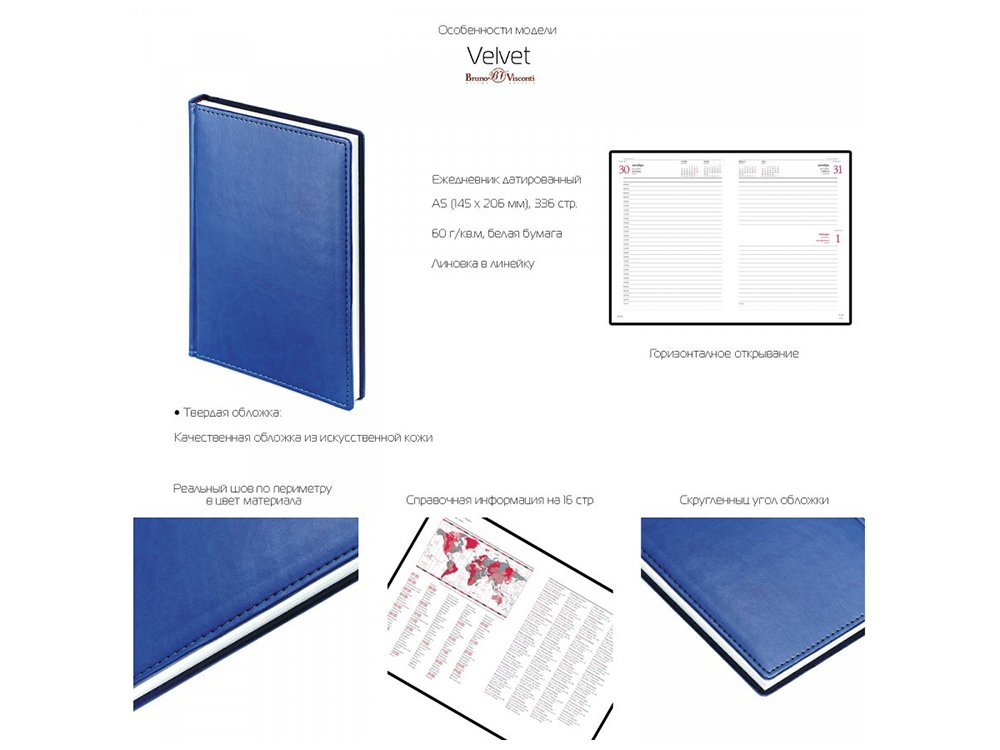 Недатированный ежедневник A5 Velvet в линейку от бренда Bruno Visconti - это качественный корпоративный подарок по выгодной цене, произведенный специально под персонализацию. Представлен в универсальном формате А5. В нем есть полезная справочная информация и телефонная книга, а также 272 страницы для записи идей, мыслей и составления рабочих планов. В серии Velvet представлены практичные и стильные модели ежедневников, в которых обложки выполнены из кожзаменителя с рельефом и прострочены по периметру декоративным швом. Закругленные уголки подчеркивают привлекательную и изящную форму ежедневника. Все ежедневники от бренда Bruno Visconti можно персонализировать с помощью тиснения обложки как блинтом, так золотой или серебряной фольгой. Ежедневники Velvet помогут быть успешным и эффективным в карьере и повседневной жизни! Ежедневник внесен в реестр российской промышленной продукции. Реестровый номер: 10733328, дата внесения 21.10.2025 Сертификат по форме СТ1 и выписку из реестра можно запросить у персонального менеджера.