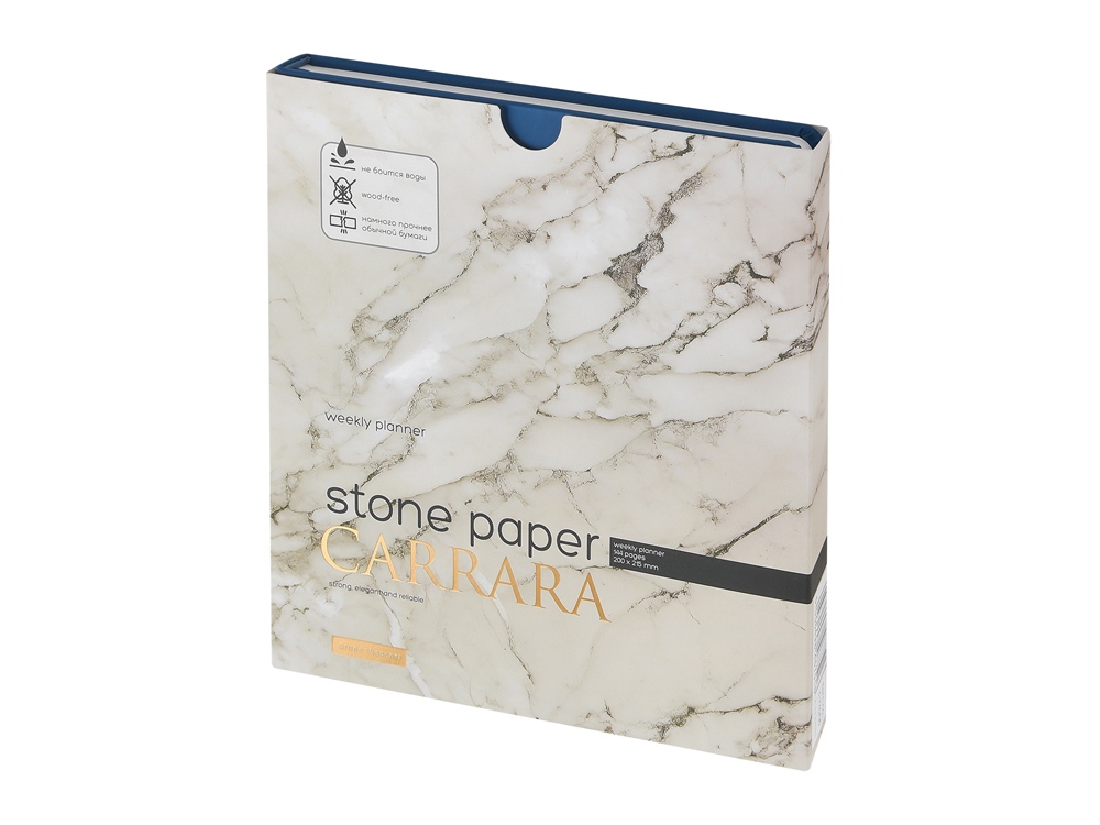 Недатированный еженедельник Carrara ТМ Bruno Visconti во всем уникален. Блок произведен из каменной бумаги плотностью 144 г/кв.м, отличающейся особой гладкостью и повышенной прочностью. Она не боится воды и пролитого кофе, достаточно просто протереть сухой салфеткой. Специально разработанная сетка блока, включает в себя и планер на год, и трендовую справочную информацию, и помесячный развернутый план, и основной блок из плана на неделю. Удобный для еженедельника квадратный формат А5+, обложка из искусственной кожи Soft Touch, блок из каменной бумаги — превосходное предложение!