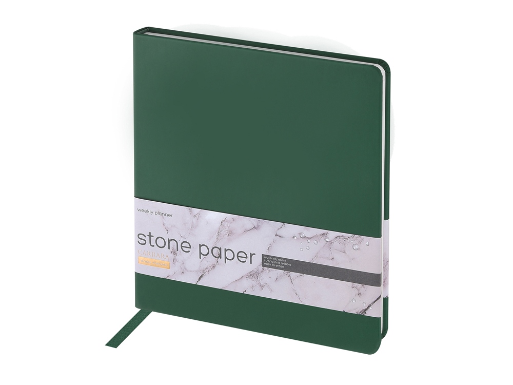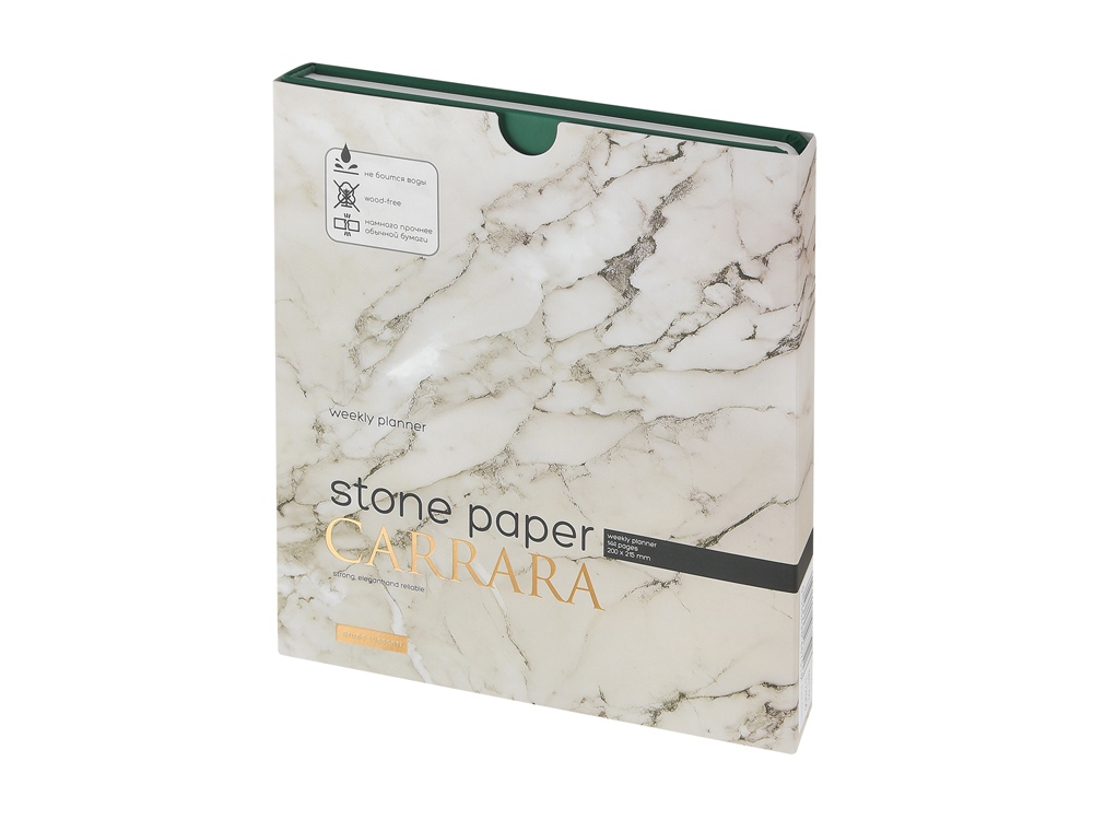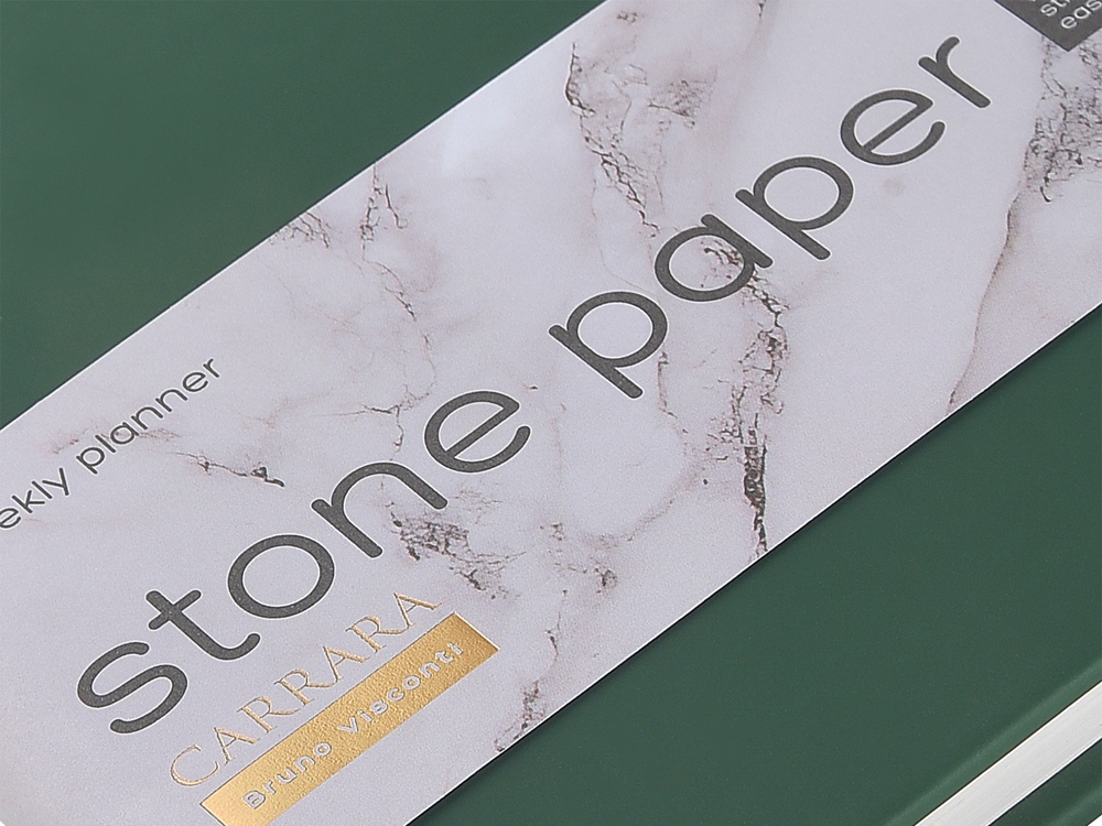 Недатированный еженедельник Carrara ТМ Bruno Visconti во всем уникален. Блок произведен из каменной бумаги плотностью 144 г/кв.м, отличающейся особой гладкостью и повышенной прочностью. Она не боится воды и пролитого кофе, достаточно просто протереть сухой салфеткой. Специально разработанная сетка блока, включает в себя и планер на год, и трендовую справочную информацию, и помесячный развернутый план, и основной блок из плана на неделю. Удобный для еженедельника квадратный формат А5+, обложка из искусственной кожи Soft Touch, блок из каменной бумаги — превосходное предложение!