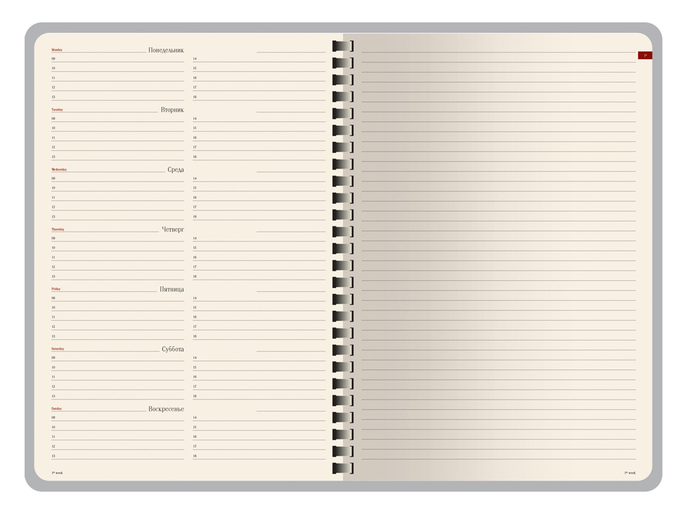 Деловые еженедельники Concept - это воплощение современного дизайна, в котором сочетаются практичные детали. Благодаря удобному формату slim-pocket еженедельник легко помещается в сумку. Еженедельник Concept в классической серой обложке формата А5. Практичный, привлекательный и приятный на ощупь материал обложки на протяжении всего срока службы сохраняет презентабельный вид. Уголки обложки имеют закругленную форму, по всему периметру сделана прострочка нитками в тон. Недатированный блок состоит из 128 страниц, укреплённых на пластиковом полускрытом гребне. На 21 странице размещена справочная информация на русском языке. День недели указан на русском и английском языках. Блок является сменным и вставляется внутрь обложки. С внутренней стороны обложка имеет вырубные отделения для визиток и кредитных карт, а также петлю для ручки на резинке. Для хранения чеков, записок и бумаг внутри расположен прозрачный пластиковый конверт.