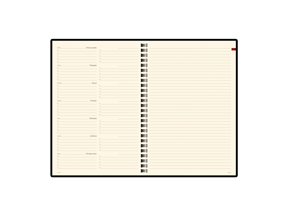 Деловые еженедельники Concept - это воплощение современного дизайна, в котором сочетаются практичные детали. Благодаря удобному формату slim-pocket еженедельник легко помещается в сумку. Еженедельник Concept в классической красной обложке формата А5. Практичный, привлекательный и приятный на ощупь материал обложки на протяжении всего срока службы сохраняет презентабельный вид. Уголки обложки имеют закругленную форму, по всему периметру сделана прострочка нитками в тон. Недатированный блок состоит из 128 страниц, укреплённых на пластиковом полускрытом гребне. На 21 странице размещена справочная информация на русском языке. День недели указан на русском и английском языках. Блок является сменным и вставляется внутрь обложки. С внутренней стороны обложка имеет вырубные отделения для визиток и кредитных карт, а также петлю для ручки на резинке. Для хранения чеков, записок и бумаг внутри расположен прозрачный пластиковый конверт.