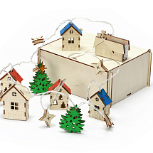 Светодиодная новогодняя елочная гирлянда постоянного свечения с цветными фигурками из натуральной березовой фанеры. Работает от 2-х батареек АА (в комплекте). Упакована в деревянную подарочную коробку со стружкой.