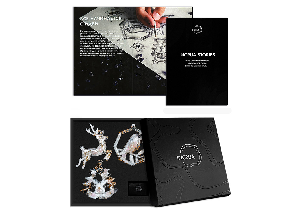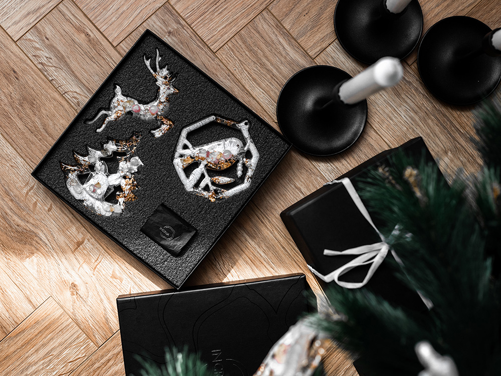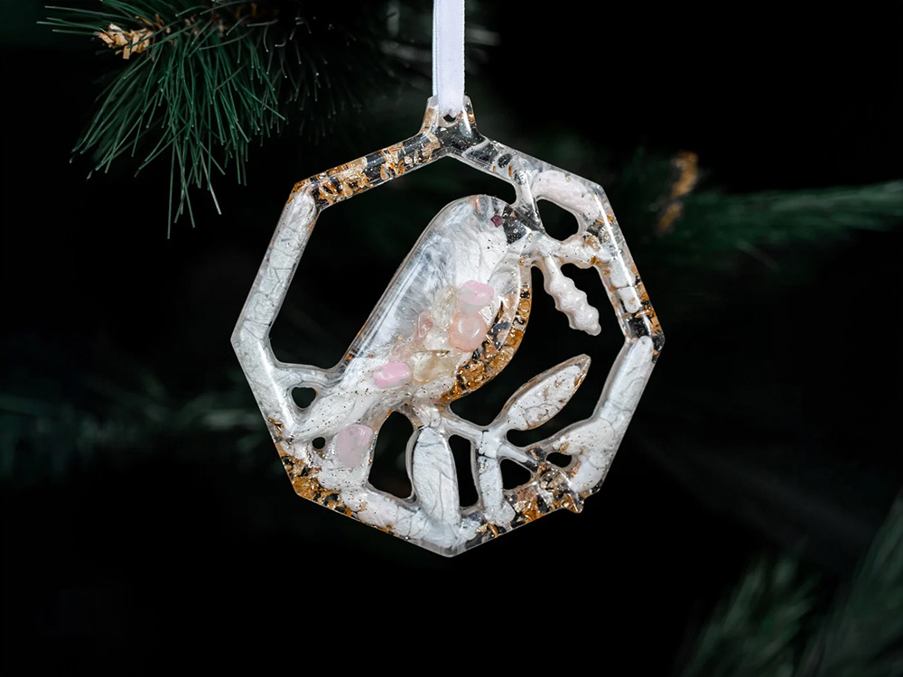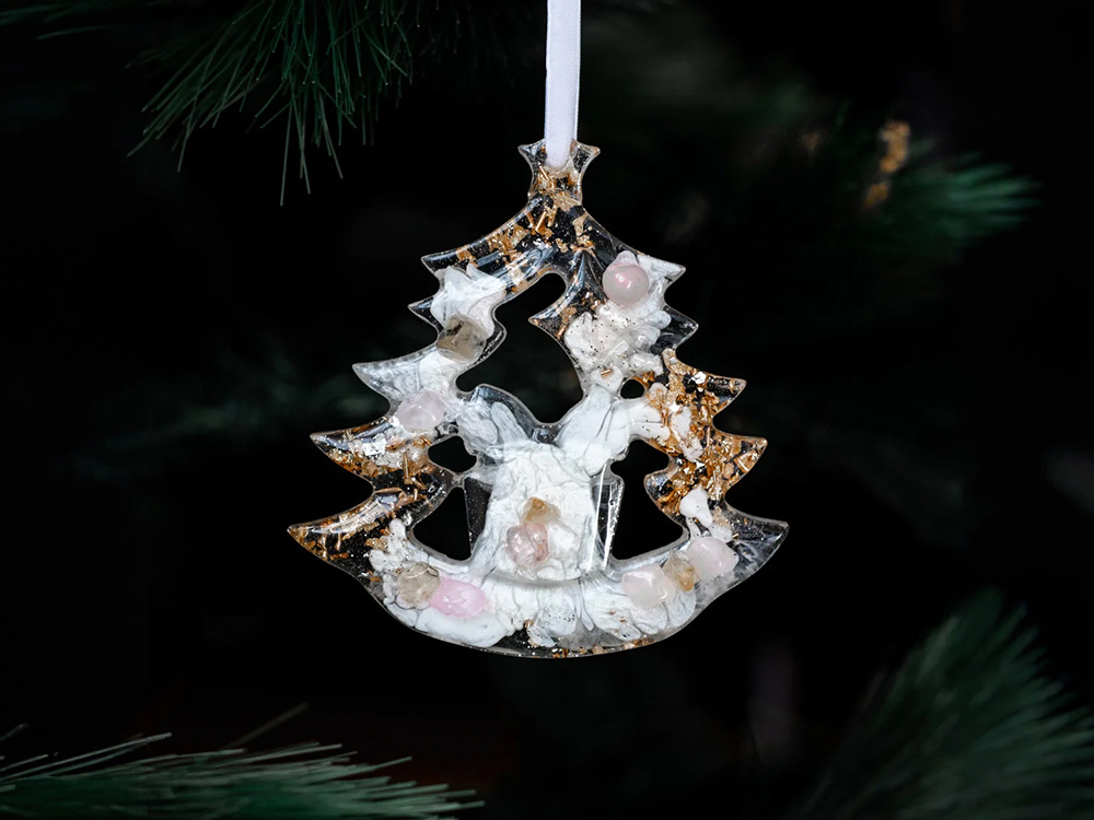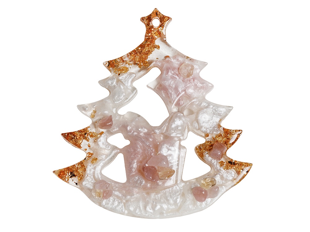 Набор из 3-х елочных игрушек: в форме оленя, снегиря и елки. Игрушки выполнены из ювелирной эпоксидной смолы и украшены галтовкой из натуральных минералов. Игрушки бережно упакованы в картонную коробку с внутренним вкладышем, который надежно фиксирует их внутри. Для вашего удобства к каждой игрушке прилагается элегантная ленточка, с помощью которой вы легко сможете подвесить их на ёлку.